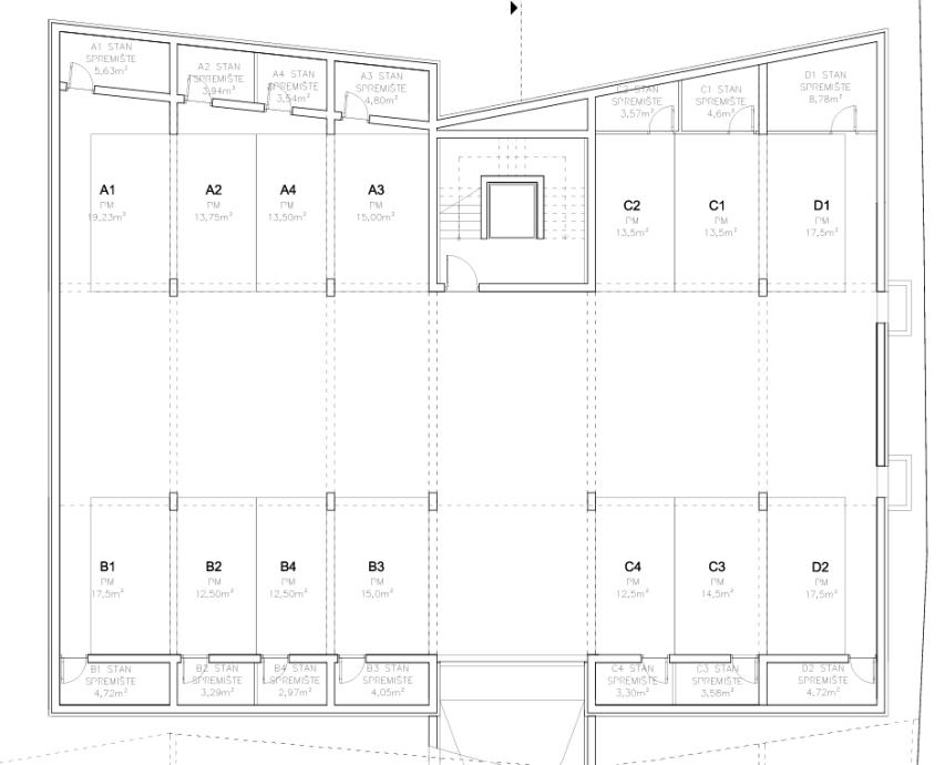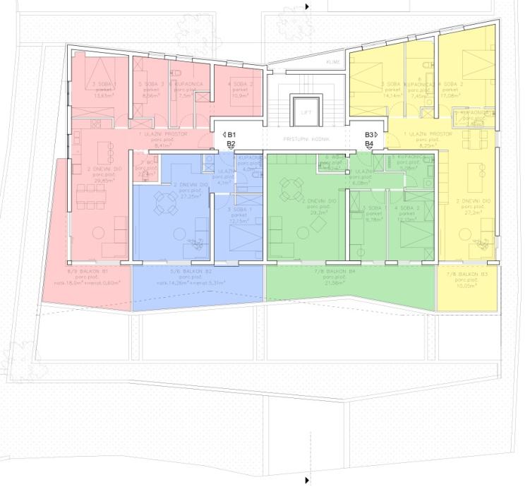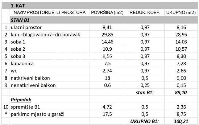 Stan B1 ističe se izuzetno funkcionalnim rasporedom i velikim vanjskim prostorom koji uključuje natkrivenu i nenatkrivenu terasu, s kojih se pruža prekrasan pogled na more. Ukupna neto korisna površina 100,21 m2. Stan se sastoji od ulaznog prostora, tri prostrane spavaće sobe, kupaonice, dodatnog wc-a te otvorenog dnevnog prostora koji povezuje kuhinju, blagovaonicu i dnevni boravak, pružajući ugodan ambijent za svakodnevni život. Dodatnu vrijednost stanu daje spremište te vlastito garažno parkirno mjesto s pripremom za punjenje električnih vozila.