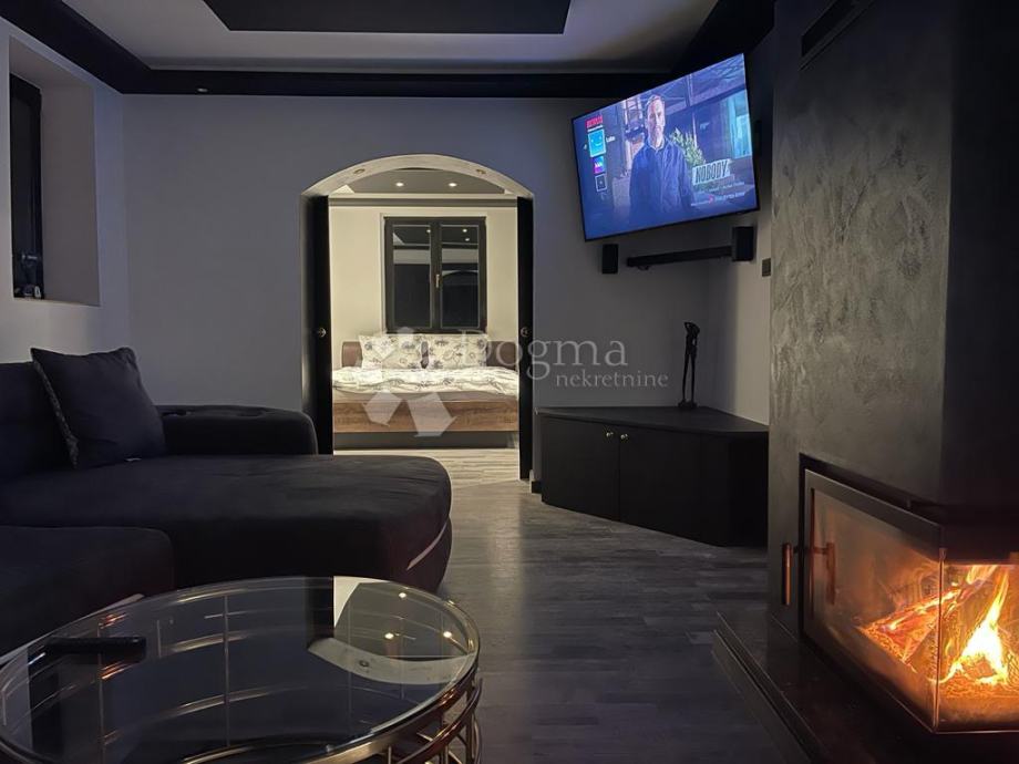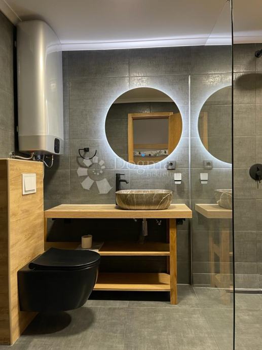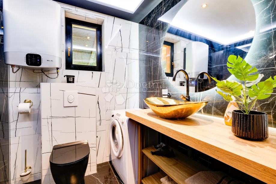 Kuća se sastoji od 2 sobe, kupaone s walk in tuš kabinom i podnim grijanjem , moderna kuhinja s perilicom, indukcijom, pećnicom, napom.