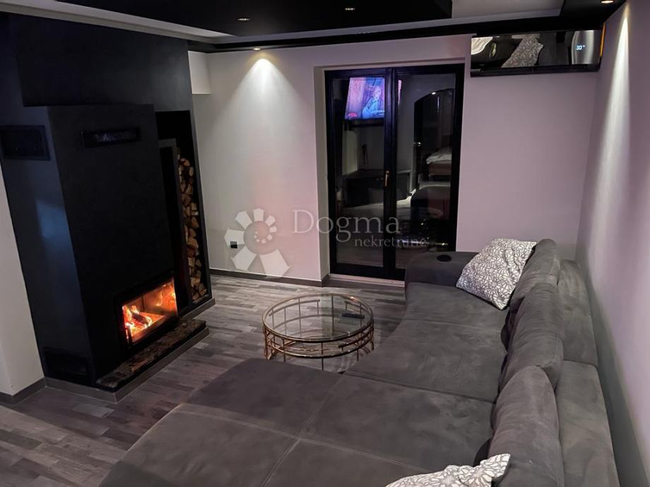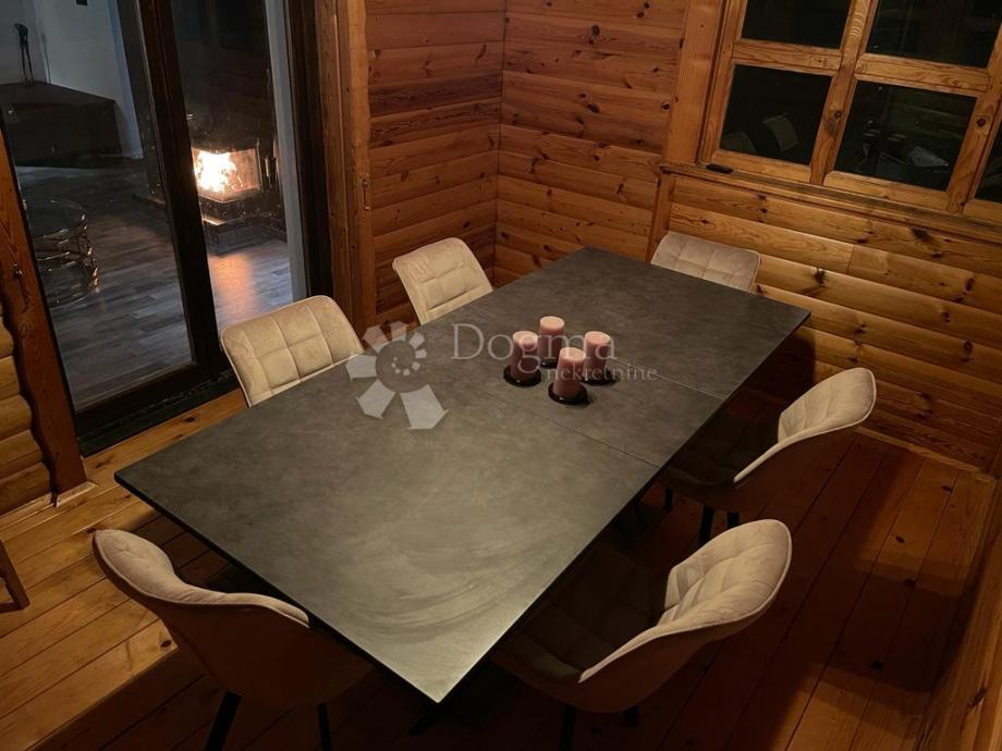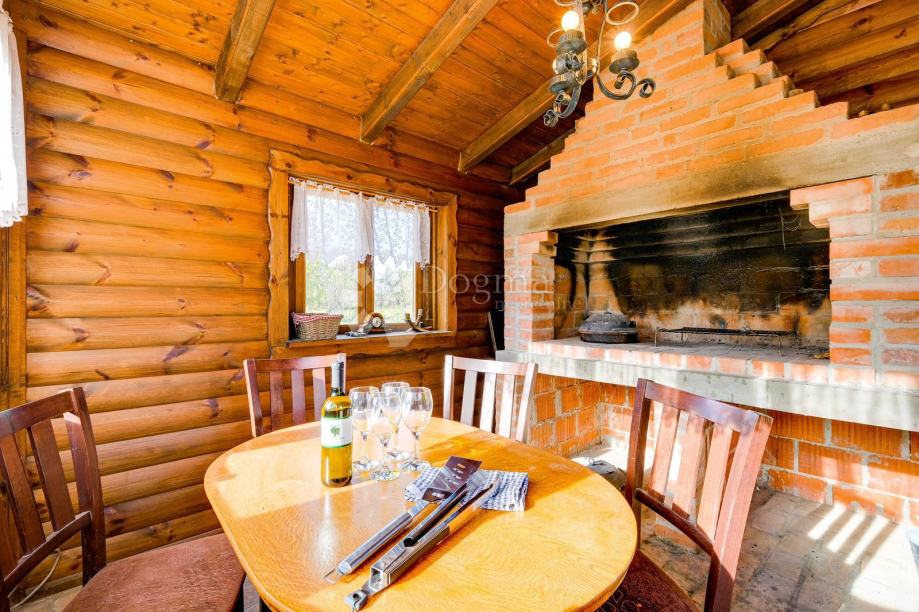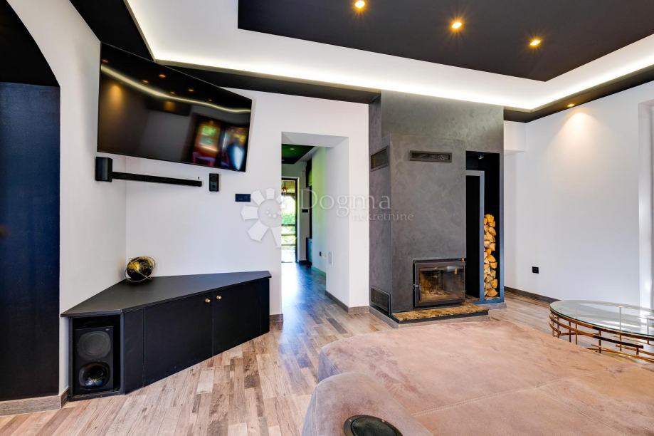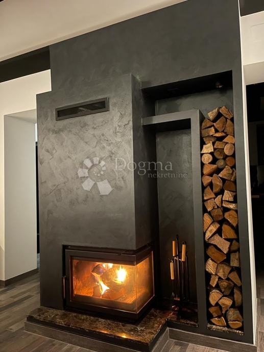 Dnevni boravak opremljen je s kaminom na drva , velikom kutnom garniturom te blagovaonicom.