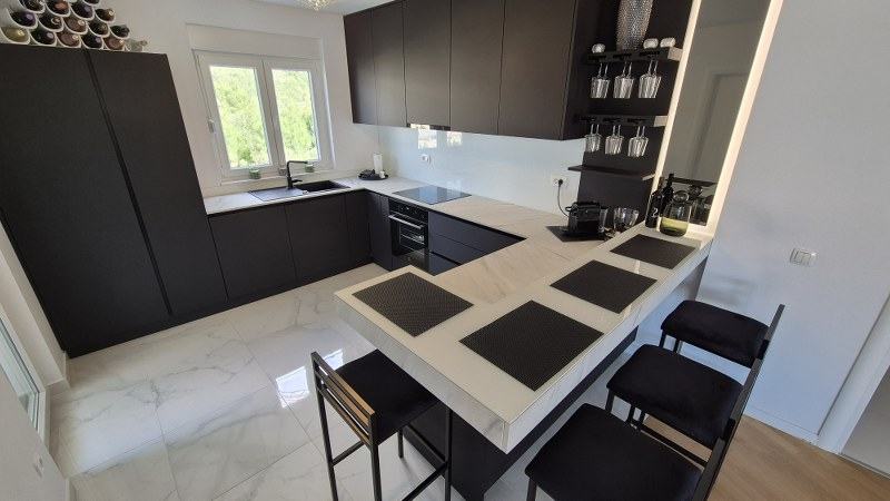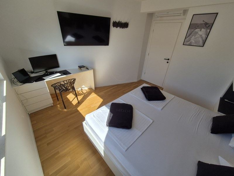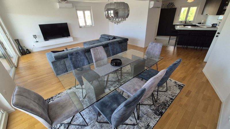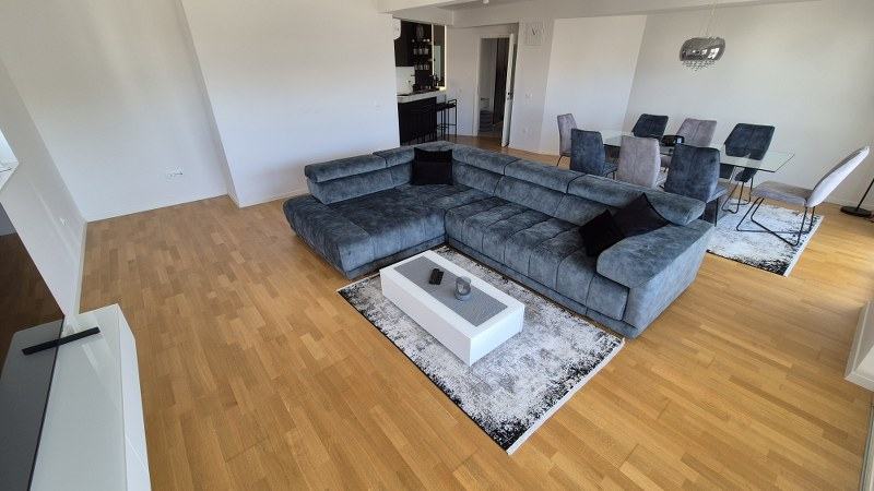 Stan je potpuno opremljen i luksuzno namješten, svaka prostorija u stanu je klimatizirana inverter uređajima sa vanjskom jedinicom na krovu zgrade. U stanu se nalaze svi aparati od renomiranih svjetskih proizvođača i kvalitetan namještaj izrađen po mjeri. Stan je potpuno opremljen i luksuzno namješten.