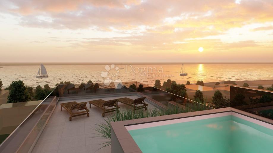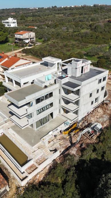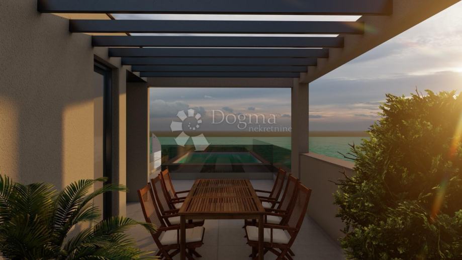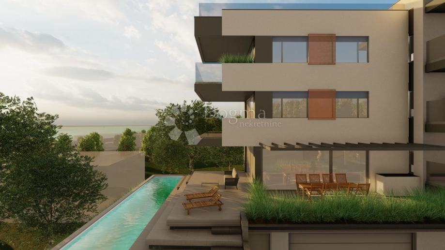 U novoj zgradi u Kožinu, samo 100 m od mora upravo se dovršava prostrani stan u prizemlju, sa svojim vlastitim vrtom (135 m2) i bazenom. Stan ima 4 spavaće sobe, 3 kupaonice, sobu za wellness, dok samo dnevni boravak i kuhinja imaju 43 m2.