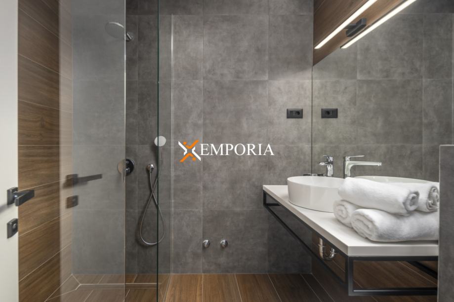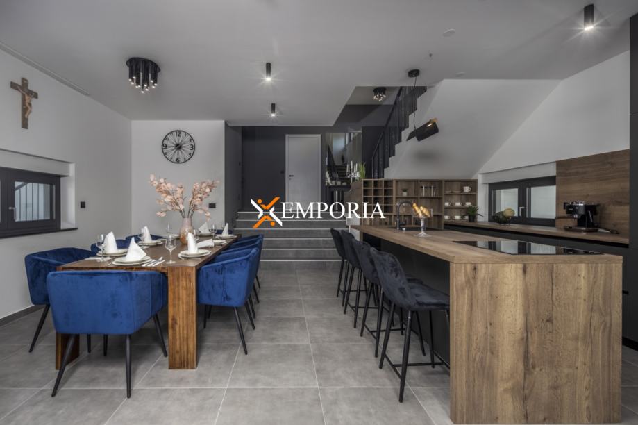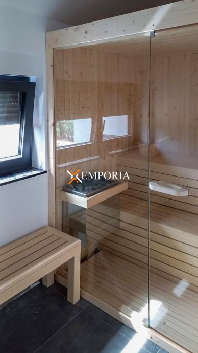 Podne obloge su pločice. Prozori su aluminijski s troslojnim staklom, električnim roletama i komarnicima. U svakoj prostoriji se nalazi po jedan klima uređaj. Napravljene su pripreme za centralno grijanje u kući, tj. provedene su instalacije za to. Na garaži su solarni paneli koji se koriste za proizvodnju tople vode. Ulazna vrata su aluminijska Schüco.Lokacija nekretninePridraga je mjesto u sastavu Općine Novigrad smještena na poluotoku između Novigradskog i Karinskog mora. Pridraga je jako lijepo, ugodno i mirno mjesto odlično za odmor, a obalu krase prekrasne plaže. Udaljenost od Zadra iznosi svega 35 km.Ostale informacijeUkoliko ste ovu nekretninu vidjeli negdje drugdje po nižoj cijeni, ista cijena vrijedi i kod nas!https://www.emporia-nekretnine.com/property/kuca-h596-novigrad-pridraga/____________________Zum Verkauf steht eine äußerst schöne, neu gebaute Villa mit Swimmingpool und Sauna, gelegen in der ersten Reihe zum Meer in Pridraga. Der Meerblick vom Haus aus ist wunderbar. Es liegt in einer ruhigen Gegend, umgeben von Pinien.