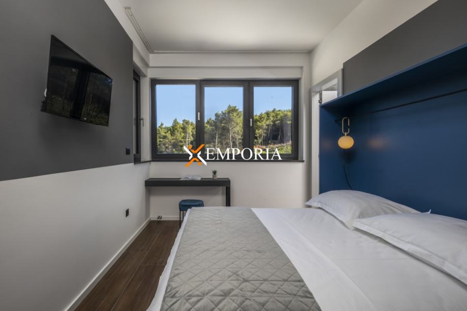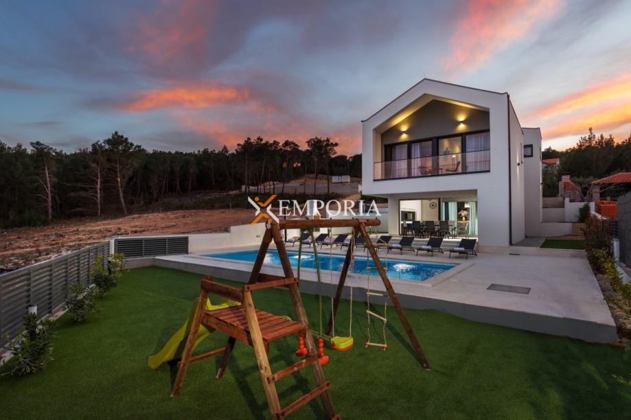 Prodaje se izuzetno lijepa, novoizgrađena vila s bazenom i saunom smještena u prvom redu do mora u Pridrazi. Pogled na more iz kuće je divan. Nalazi se u mirnom susjedstvu okruženom borovima.