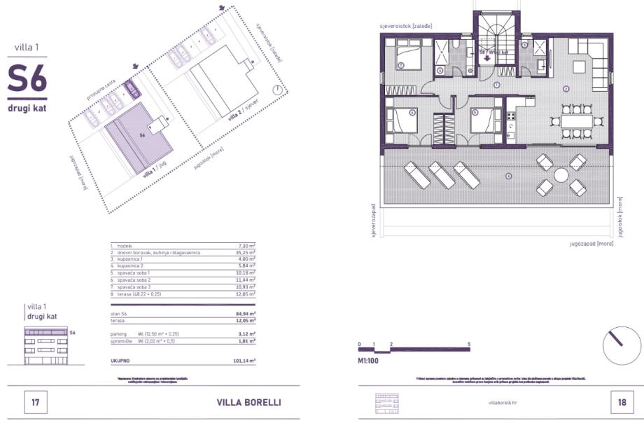 Jedan od istaknutih stanova u ovom projektu je Stan S6, smješten na drugom katu vile 1, ukupne neto površine od 65,20 m2. Stan je jugoistok orijentacije, što omogućava obilje prirodnog svjetla tijekom cijelog dana. Raspored stana osmišljen je kako bi pružio maksimalnu udobnost i funkcionalnost. Prostrani otvoreni prostor uključuje kuhinju, blagovaonicu i dnevni boravak, stvarajući idealan ambijent za obitelj i druženja. Stan također sadrži tri udobne spavaće sobe te dvije potpuno opremljene kupaonice. Posebni adut ove zgrade je terasa površine 12m2 sa koje se pruža prekrasan pogled na more.