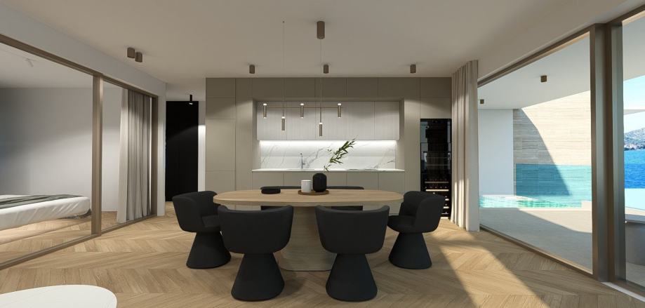 Stan se sastoji od prostranog dnevnog boravka s kuhinjom i blagovaonicom u otvorenom konceptu, iz kojeg se izlazi na terasu sa pogledom na more i pripadajućim bazenom. Tri spavaće sobe od kojih dvije imaju vlastitu kupaonicu, sobe su jedinstvene po tome što je cijela strana zida u staklu i time se dobiva jedinstveni pogled na more i otoke. Stanu ima još jednu kupaonicu, ukupno tri.