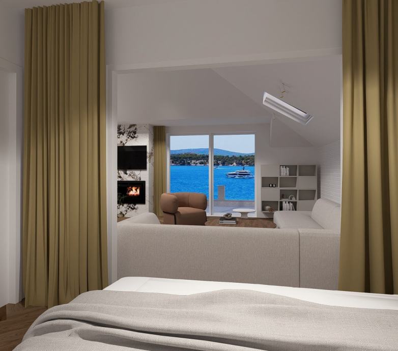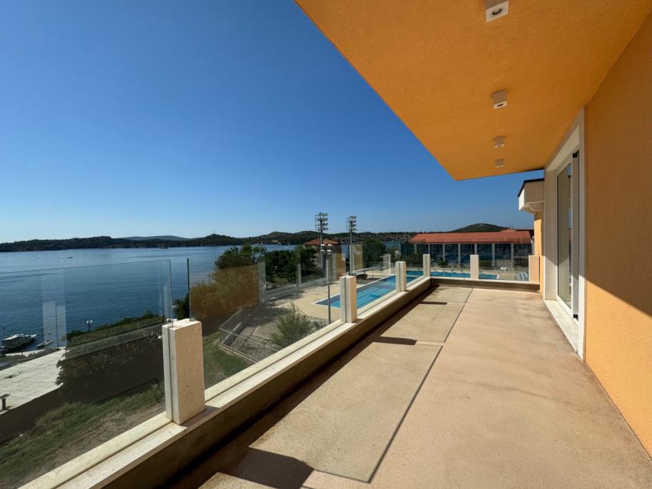 Na prodaju je luksuzni stan površine 138m2 koji se nalazi u potpuno uređenoj zgradi sa liftom. Zgrada se nalazi na 50 metara od mora i zbog svoje pozicije pruža jedinstveni pogled na stari grad, tvrđavu i more. Cijeli eksterijer oko zgrada će biti uređen i ozelenjen, svaki od stanova ima osigurano parking mjesto. Uz zgradu nalazi se unutarnji i vanjski gradski bazen te je isti moguće koristiti tokom cijele godine. Podno zgrade se nalazi šetnica uz more te se istom dolazi do stare gradske jezgre, plaža Banj se nalazi na 70m od zgrade. Cijela zgrada je orijentirana južno te svi stanovi imaju nesmetani pogled na more