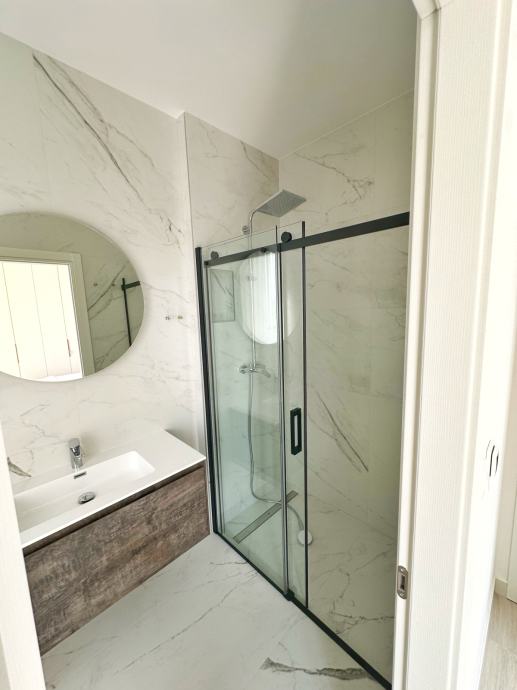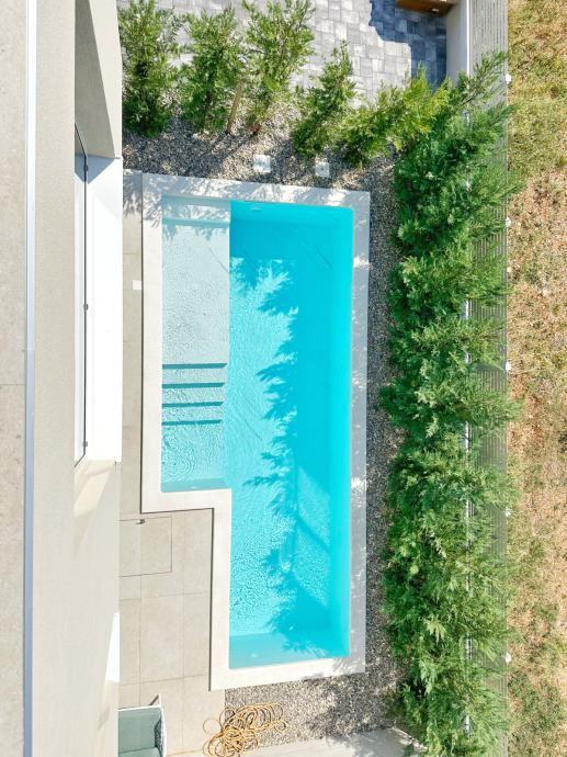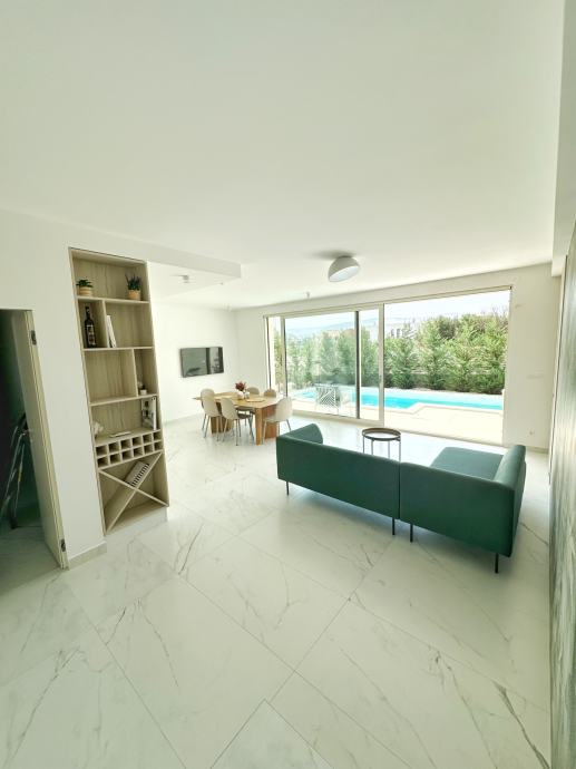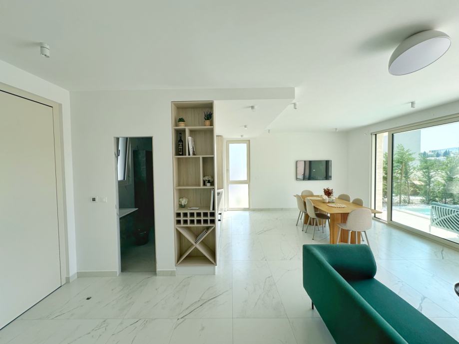 Prizemlje: Prostrani dnevni boravak otvorenog tipa, s blagovaonicom i moderno opremljenom kuhinjom. Velike klizne staklene stijene vode prema privatnom dvorištu s bazenom, što čini ovaj prostor savršenim za druženja i opuštanje. Također se na prizemlju nalazi kupaonica s tuš kabinom.