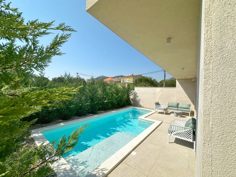 Prodaje se luksuzna nekretnina u Seget Vranjicu, svega 70 metara udaljena od mora, savršeno pozicionirana za one koji traže privatnost i eleganciju modernog doma, a istovremeno žele blizinu mediteranskog načina života. Ova iznimna duplex zgrada, koja se prostire na 200 m² netto unutarnjeg prostora, osmišljena je kao dva zasebna luksuzna stana (maisonette), svaki s vlastitim ulazom, dvorištem, bazenom i vanjskim sunčalištem.