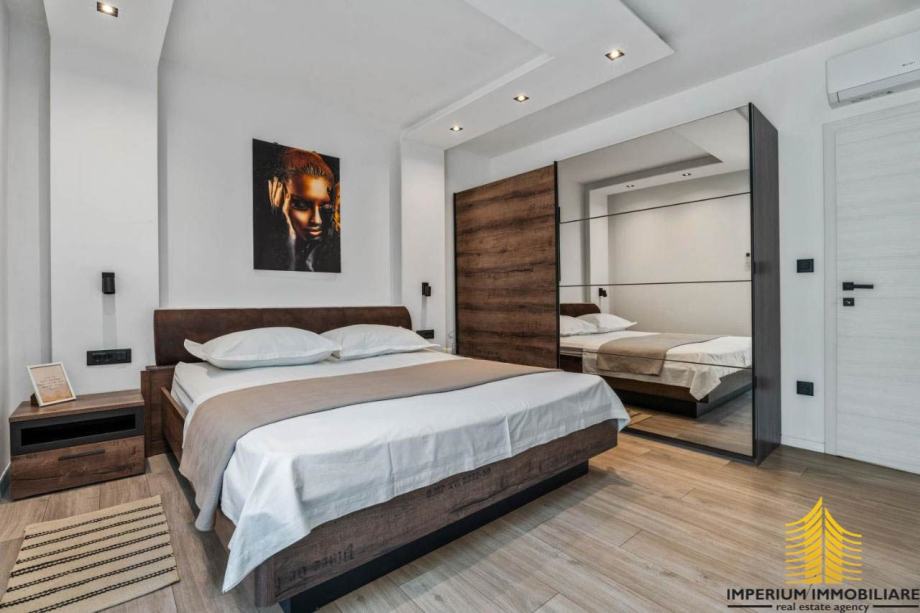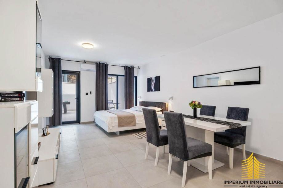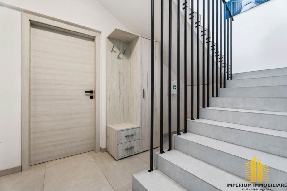 Nalazi se na zemljištu od 1.140 m2, s ukupno 350 m2 stambenog prostora elegantno raspoređenog na dvije razine. Prizemlje sadrži apartman s potpuno opremljenom kuhinjom, blagovaonicom, udobnom spavaćom sobom i elegantnom kupaonicom. Apartman ima pristup djelomično natkrivenoj terasi opremljenoj raznolikim sadržajima i fitness spravama. Na istoj razini nalaze se i spremište te praonica.