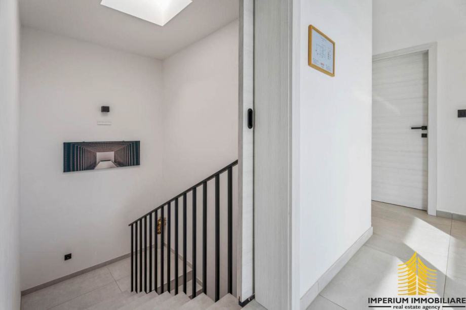 Vila ima unutarnje stepenice koje povezuju dvije etaže. Na gornjoj se nalazi dnevni boravak, blagovaonica i kuhinja. Staklene stijenke omogućavaju izlaz na vanjsku terasu s otvorenim pogledom na more, savršeno nadopunjujući pažljivo osmišljenu okućnicu.