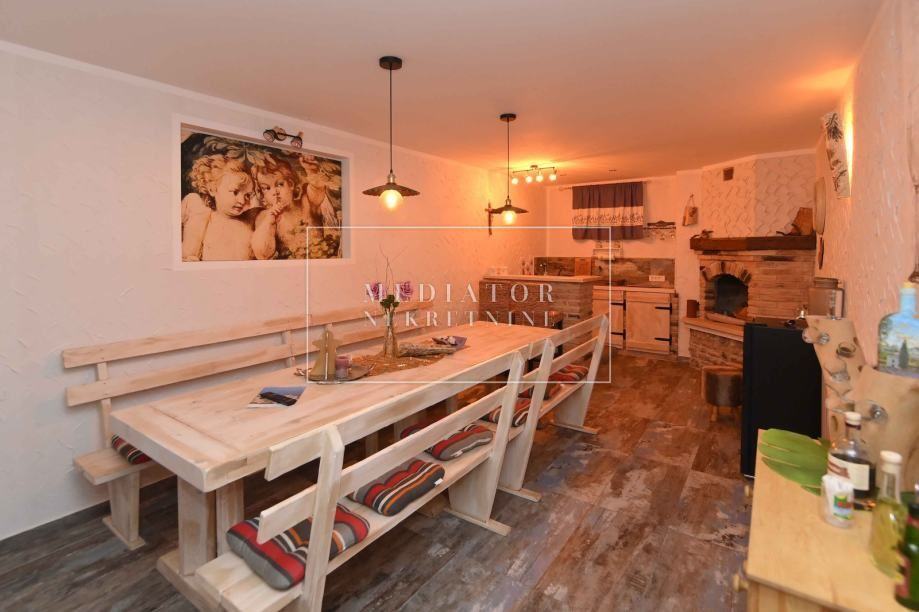 Prizemni dio sastoji se od manjeg studio apartmana te nevjerojatno uređene rustikalne konobe s kaminom za druženje koja je na raspolaganju svim gostima.
