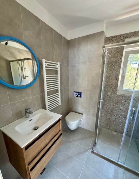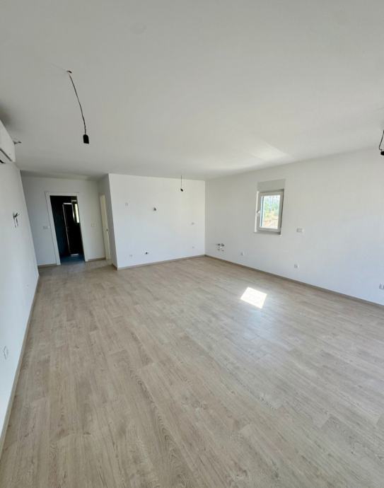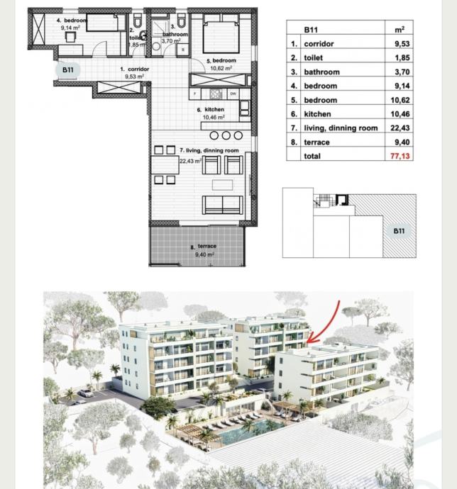 ZGRADA B, stan B11 smješten na 2. katu moderne stambene zgrade proteže se na 67,73 m2 unutarnjeg stambenog prostora, 9,4 m2 natkrivene terase, južno orijentirane s koje se pruža pogled na more te velikog garažnog parkirnog mjesta GM8 16,34 m2.