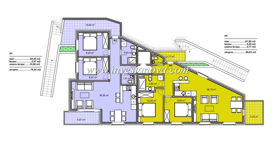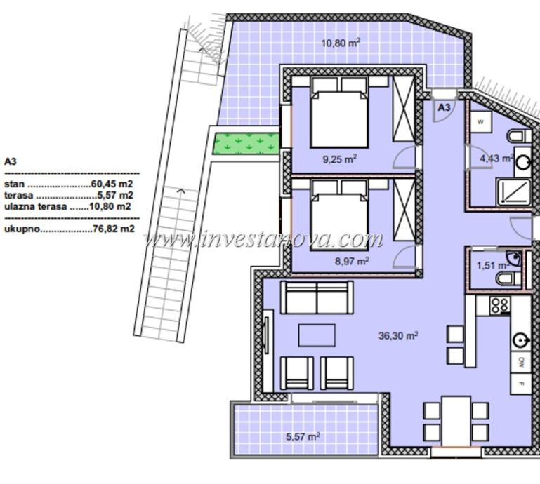 Ovaj dvosoban stan nalazi se na 1. katu brutto površine 76,82 m2 a sastoji se od vlastitog ulaza sa terasom, hodnika, dvije spavaće sobe, kupaonice, zahoda, dnevnog boravka s kuhinjom i blagovaonicom te terase.