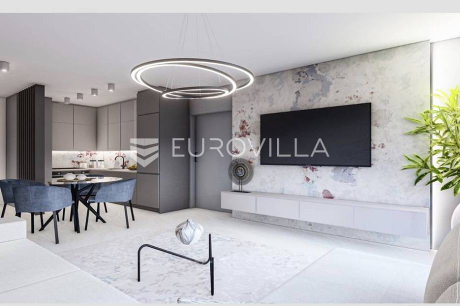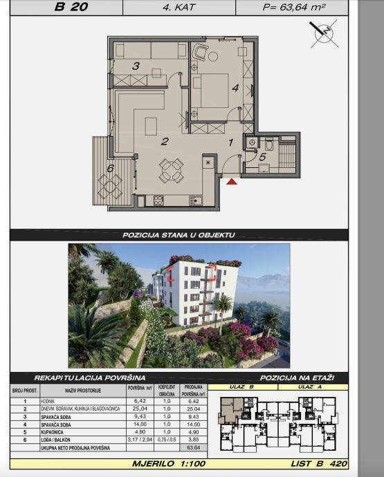 B20Dvosoban stan položen na tzadnjem, četvrtom, katu zgrade u izgradnji, površine 63.64m2. Sastoji se od hodnika, dnevnog dijela s kuhinjom, blagovaonom i boravkom, jedne spavaće sobe, kupaonice, lođe i balkona.Izgradnja zgrade započela je sredinom ožujka 2022. godine, a završetak radova se...