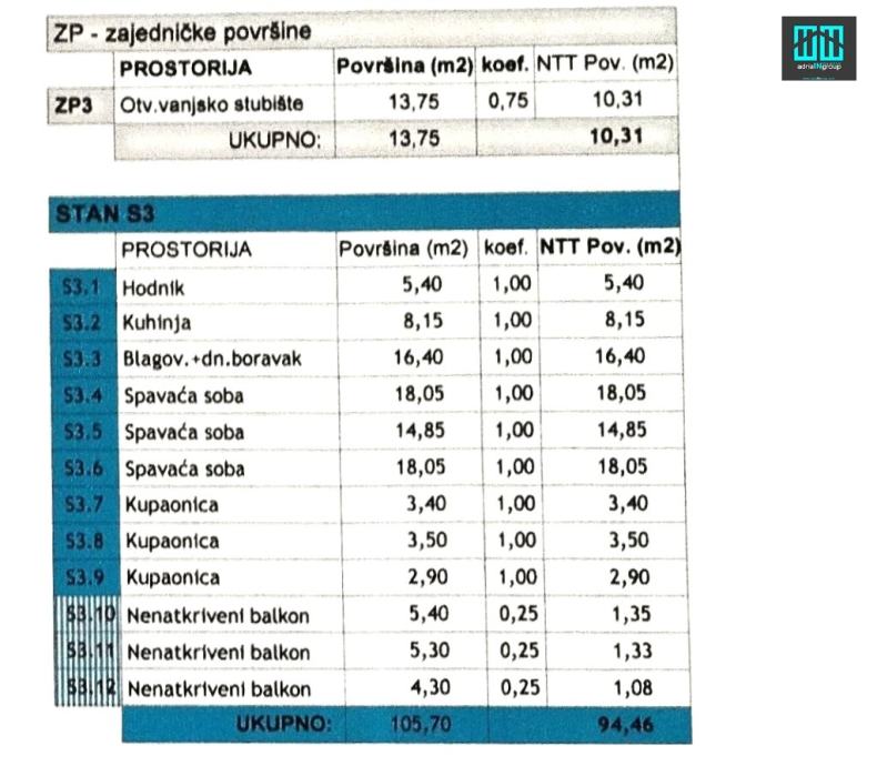 Stan se nalazi na drugom (zadnjem) katu stambene duplex kuće, s posebnim ulazom kroz vanjske natkrivene stepenice. Ukupna površina iznosi 105,70 m², a trenutna organizacija prostora uključuje tri apartmana – dva studija i jedan jednosobni stan.