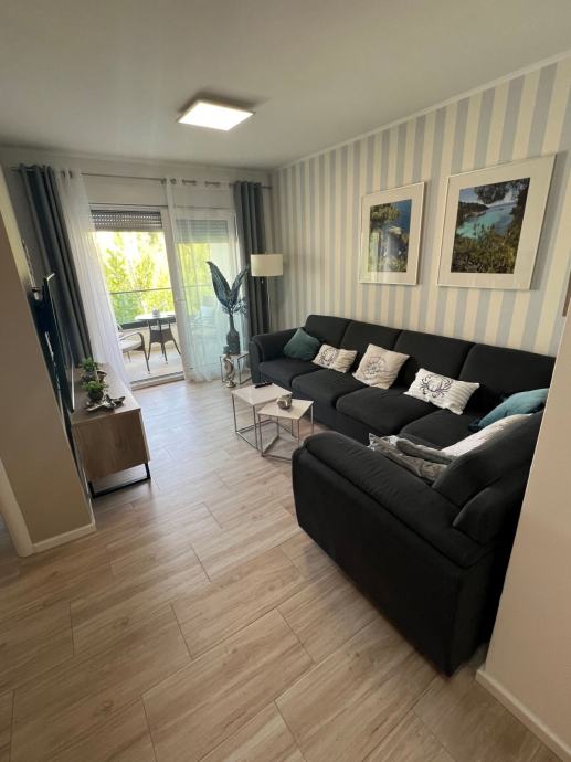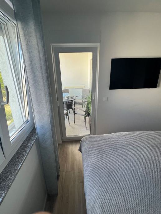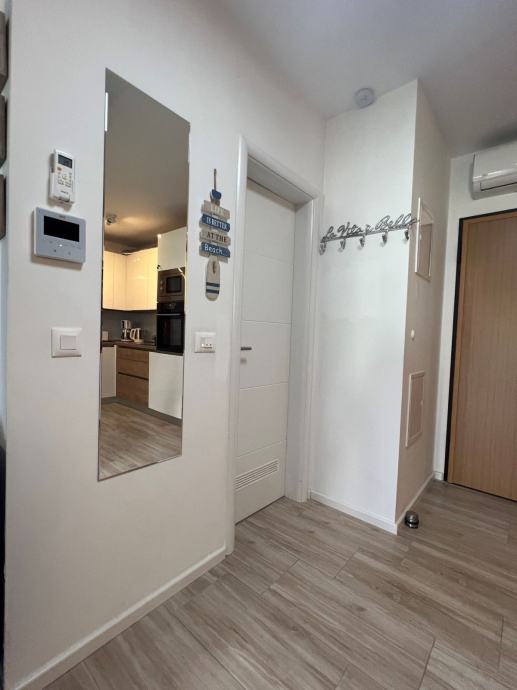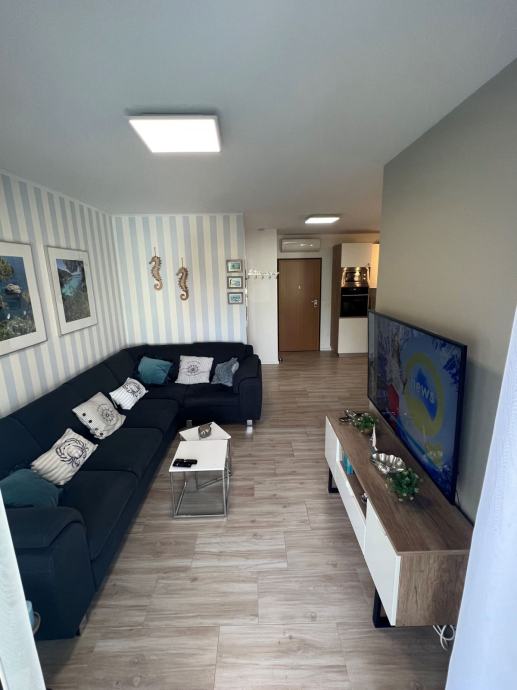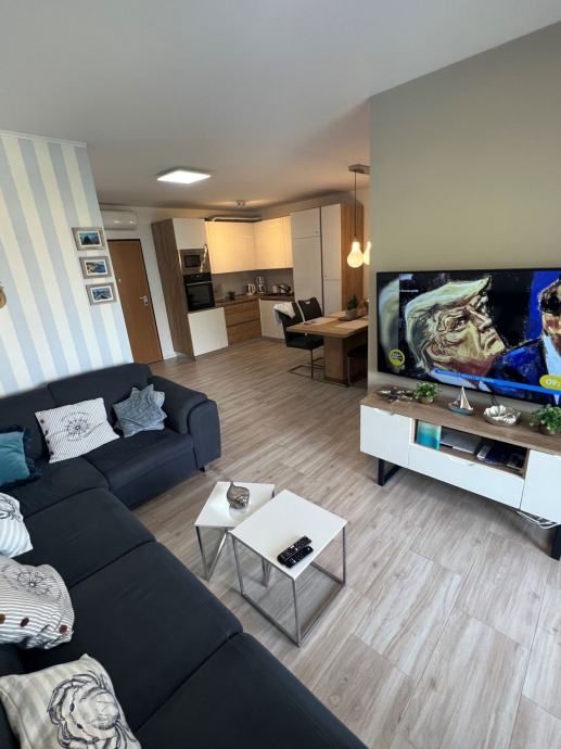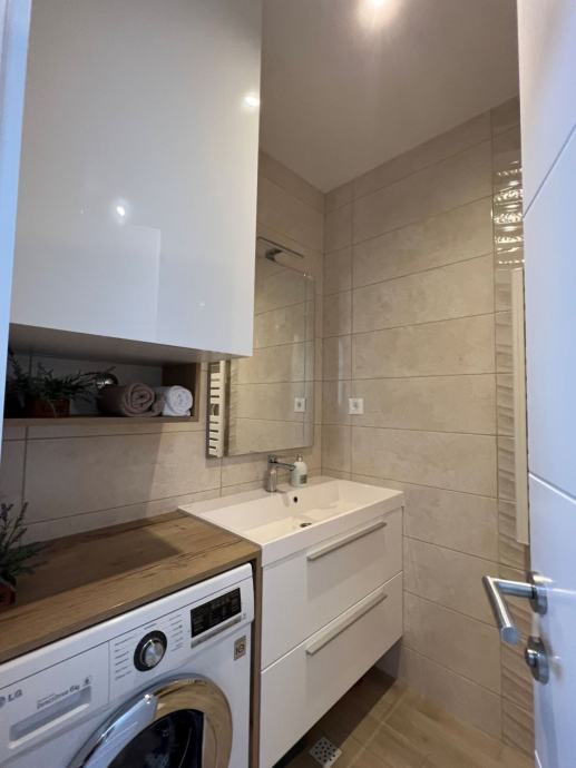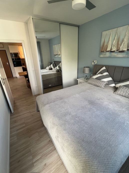 Stan se nalazi na 1 katu moderne novogradnje, a sastoji se od jedne spavaće sobe opremljene klima uređajem i TV-om, lođe od 5m2, kupaonice, kuhinje i dnevnog boravka. Stan je namješten izuzetno kvalitetnim namještajem po mjeri, kvalitetnim uređajima i opremom te se kao takav i prodaje.