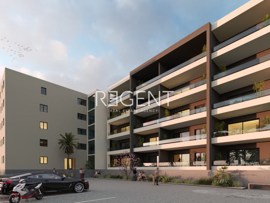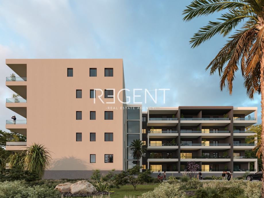 Zgrada je pozicionirana na blagoj uzvisini, pružajući vam nesmetani pogled na Jadransko more. U blizini stana nalaze se svi potrebni sadržaji, uključujući dječje vrtiće, osnovnu školu, gimnaziju, bolnicu, policijsku postaju, trgovine te prekrasne plaže koje su udaljene samo nekoliko minuta laganim hodom.