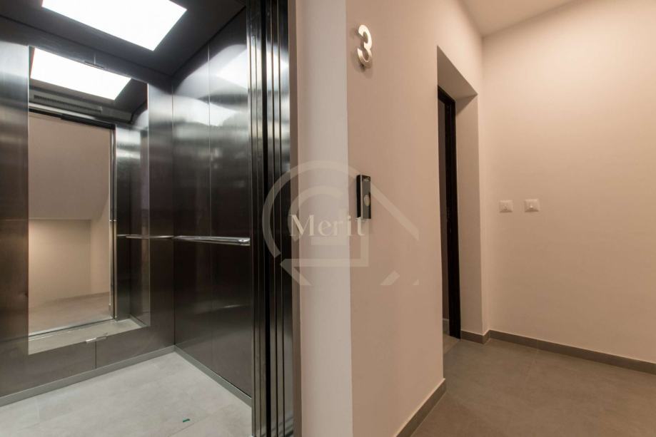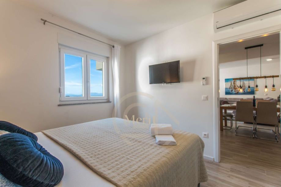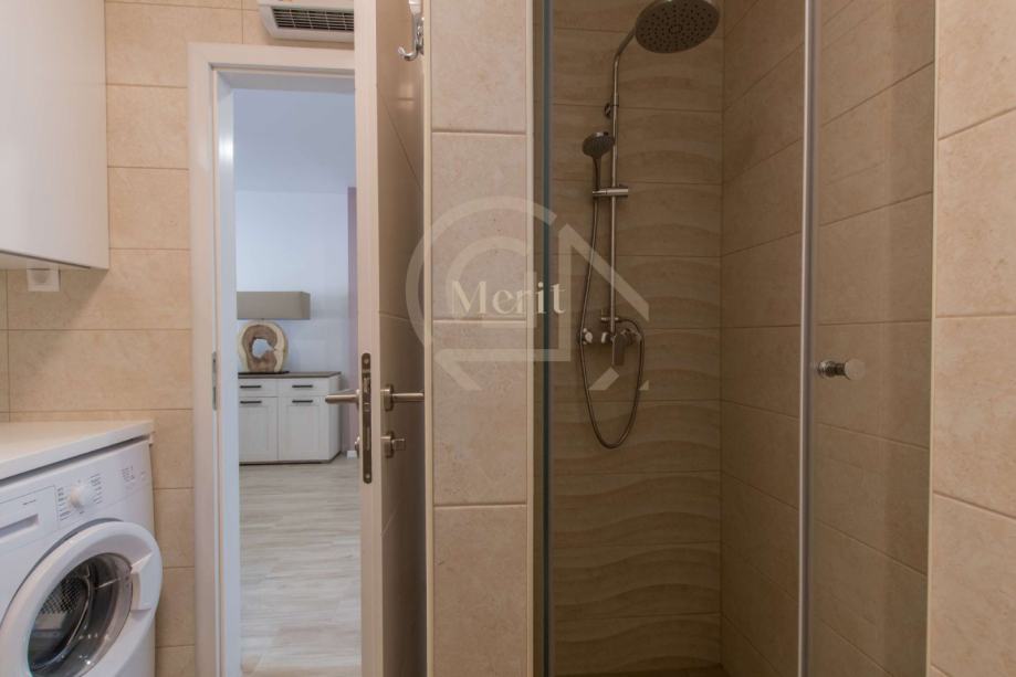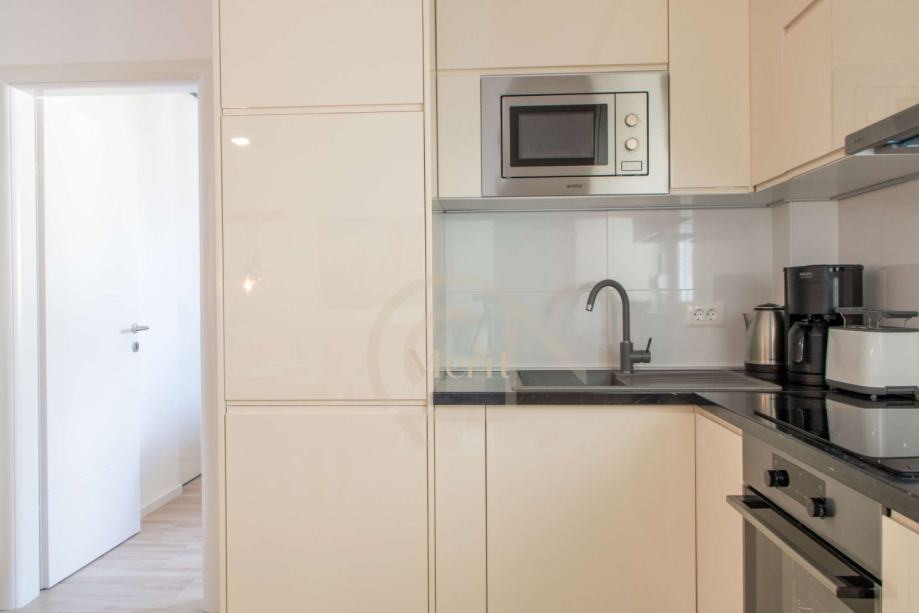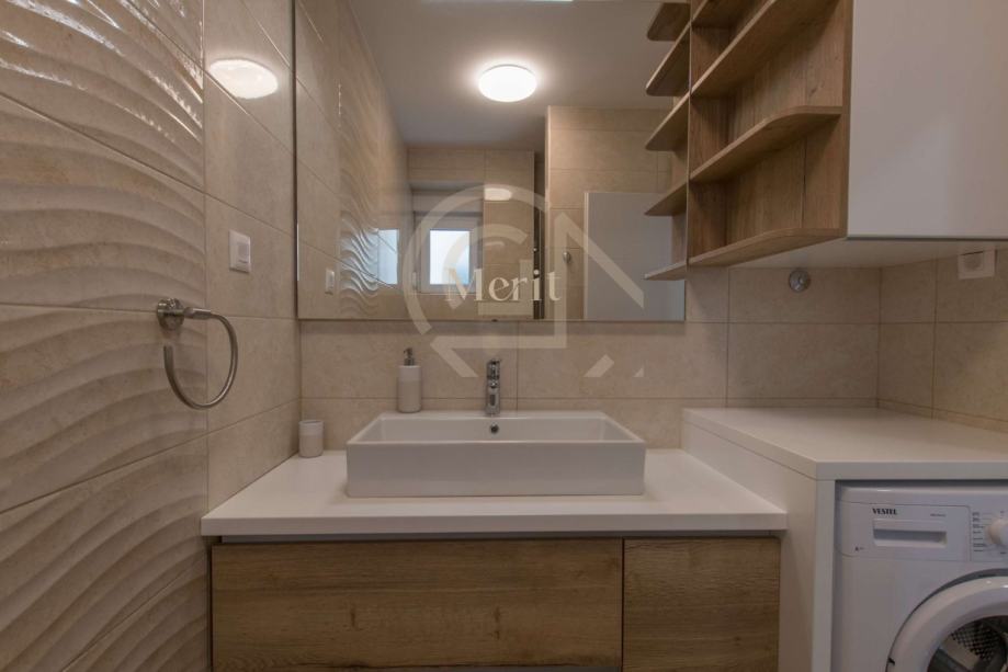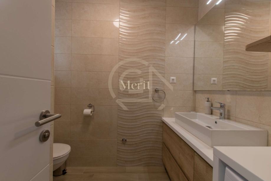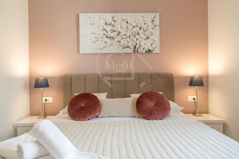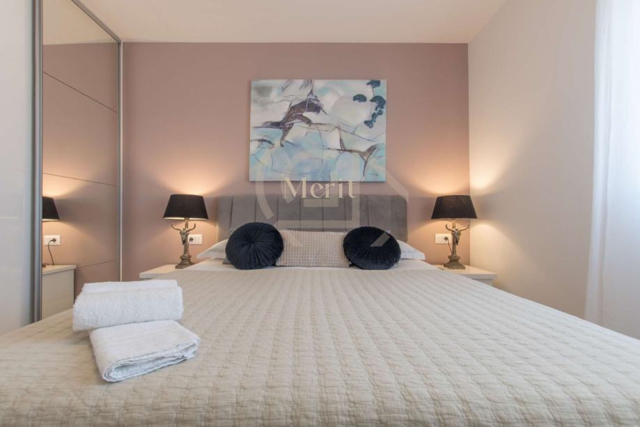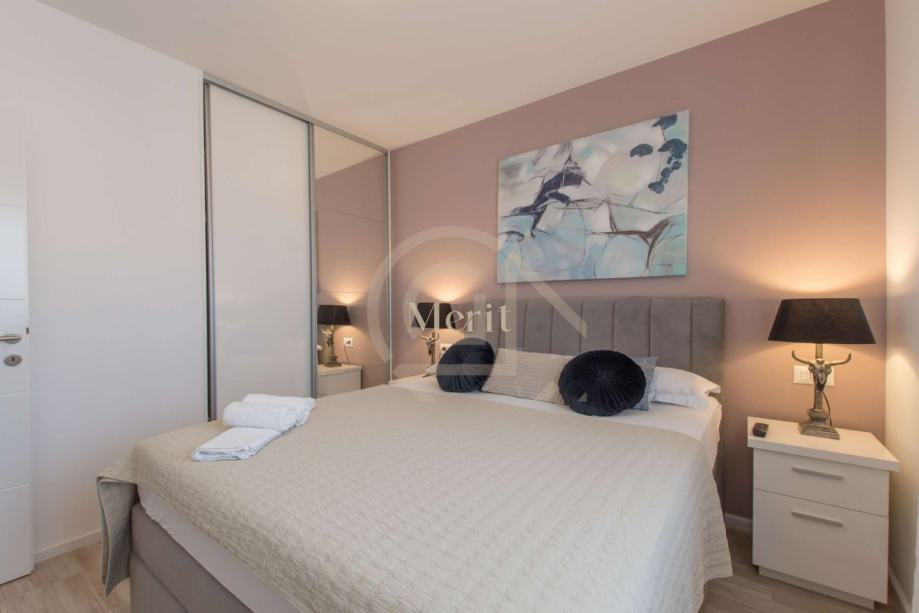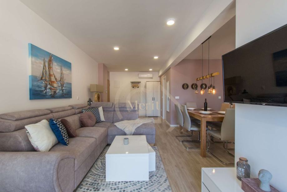 Sastoji se od dvije spavaće sobe opremljene klima uređajima i TV-om, balkona od 8m2, kupaonice, wc-a, kuhinje i dnevnog boravka. Stan je namješten izuzetno kvalitetnim namještajem po mjeri, kvalitetnim uređajima i opremom te se kao takav i prodaje.