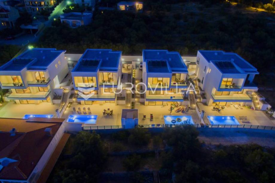 Vila 1 površine oko 350m2 (suteren, prizemlje i kat), a površina pripadajuće parcele iznosi oko 420m2.Villa ima otvoren pogled na more i otoke s jedne strane te na planinu Biokovo s druge.Cijeli kompleks je pomno dizajniran i kompletno opremljen svim sadržajima i opremom potrebnom za stanovanje...
