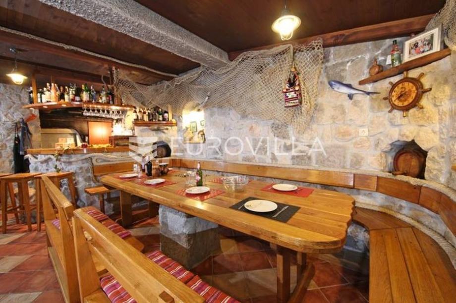 Konoba s roštiljem, krušnom peći (u izgradnji) i terasom u kojoj može blagovati do 30 ljudi, nalazi se uz kuću i s njom je povezana dvama ulazima, velikim dvokrilnim drvenim vratima. U njoj je veliki ugostiteljski štednjak sa 4 plinska rešoa, veliki ugostiteljski sudoper i veliki hladnjak za hranu i piće. Konoba kao i cijela kuća je klimatizirana s instaliranim radijatorima za centralno grijanje. Grijanje je na električnu energiju s vlastitom, na krovu instaliranom, solarnom elektranom snage 7, 2 kWh. U kući je i centralizirana topla voda s rezervoarom od 300 l koja se u ljetnim mjesecima grije solarnim kolektorima. Ovaj objekat i parcela u sebi kriju veliki potencijal jer se uz ovu kuću na istoj parceli može izmjenom građevinske dozvole dograditi još jedna kuća tlocrtne površine 150 m2 na 3 etaže.