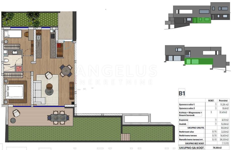 Hodnika (5,29m2),spavaće sobe (11,29 m2), spavaće sobe (8,40 m2), dnevnog boravka s blagavaonicom i kuhinjom (31,41 m2), kupaonice (4,51 m2) ukupne unutarnje površine 60,9 m2 + natkrivena terasa (14,40 m2) i nenatkrivena terasa vrt (36,30 m2).