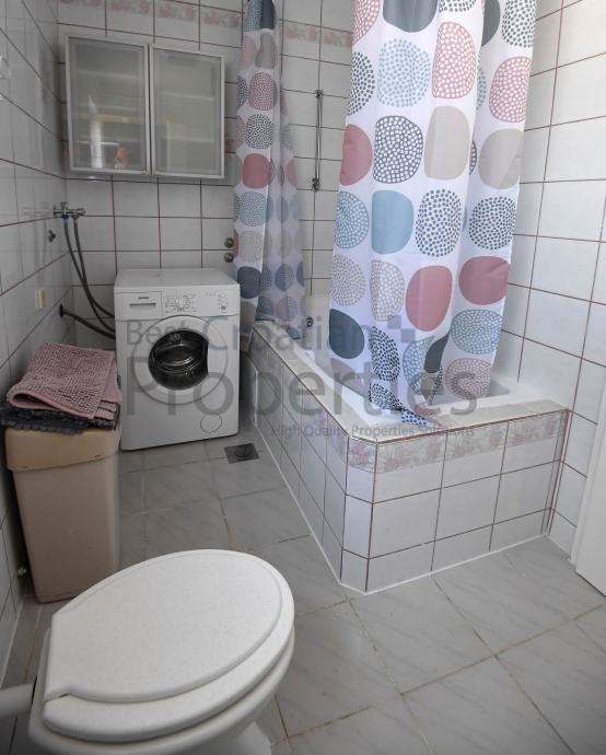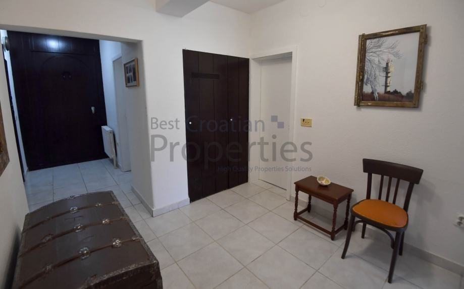 Stan ima zaseban ulaz, iz kojeg se ulazi u prostrani hodnik s kupaonom, dvije spavaće sobe, kuhinju s blagavaonom, dnevni boravak sa izlazom na prekrasnu veliku terasu, s pogledom na zelenilo.