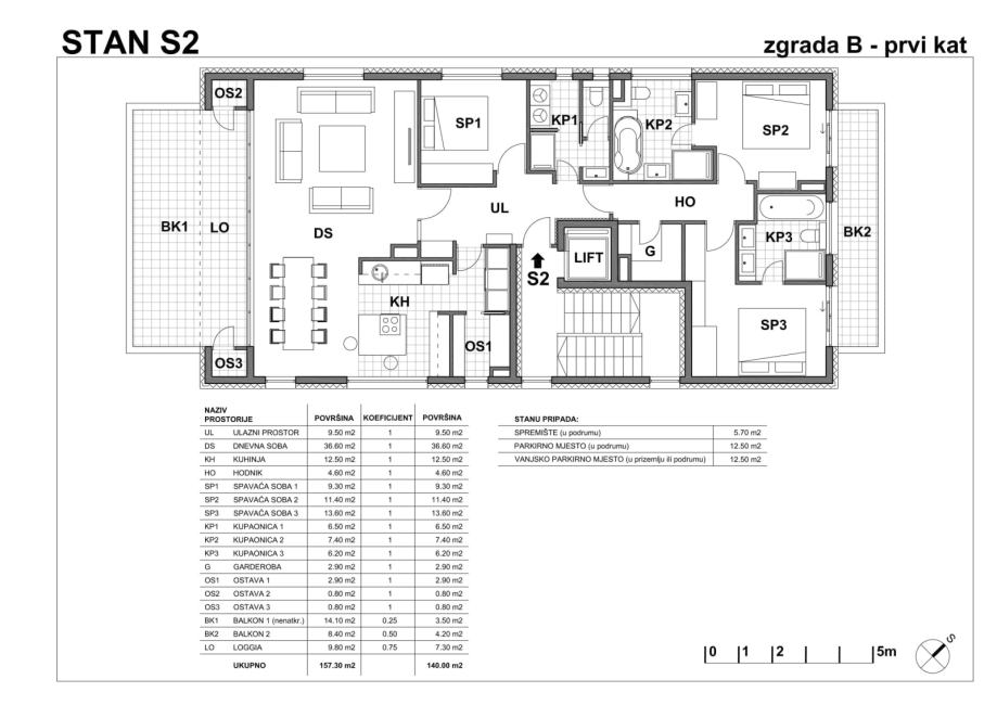 Četverosoban stan jugozapadne i sjeveroistočne orijentacije, nalazi se na 1. katu zgrade od sveukupno 2 kata. Sastoji se od ulaznog prostora, open-space kuhinje, blagovaonice i dnevnog boravka, ostave, tri spavaće sobe, tri kupaonice, garderobe, dva balkone te loggie.