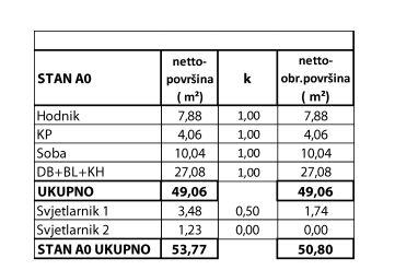 Stan se nalazi u suterenu zgrade te ima ukupnu prodajnu površinu od 50,80 m² (ukupna neto površina poda iznosi 53,77 m²), a sastoji se od ulaznog hodnika, open space dnevnog boravka s blagovaonicom i kuhinjom, spavaće sobe i kupaonice.