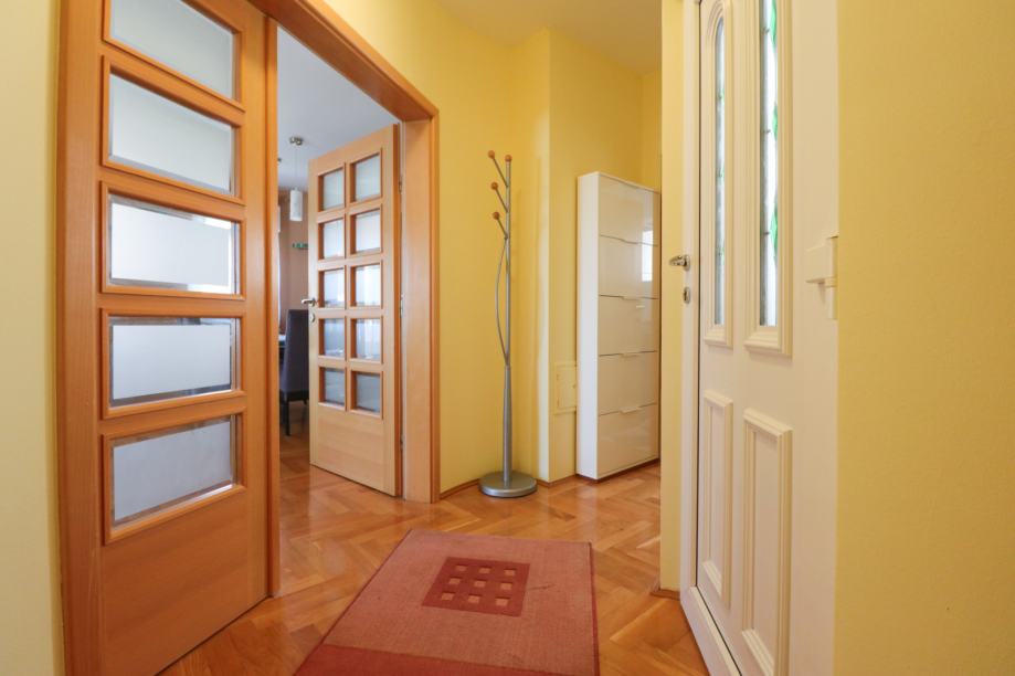 Stan je površine 110 m2, a uz to još ima i novo zasebno vanjsko spremište/kućicu te vanjsko parking mjesto. Sastoji se od hodnika, velikog dnevnog boravka s blagovaonicom i kuhinjom, kuhinjske ostave, tri velike spavaće sobe, kupaonice s jacuzzijem, WC-om i bideom te odvojenog gostinjskog toaleta. SVAKA SOBA U STANU IMA IZLAZAK NA BALKON!