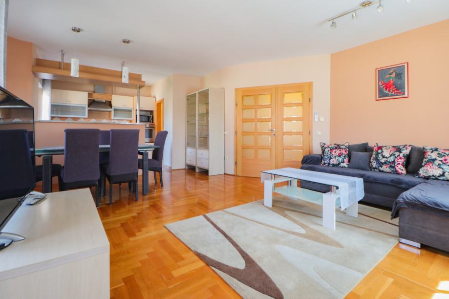 Stan je površine 110 m2, a uz to još ima i novo zasebno vanjsko spremište/kućicu te vanjsko parking mjesto. Sastoji se od hodnika, velikog dnevnog boravka s blagovaonicom i kuhinjom, kuhinjske ostave, tri velike spavaće sobe, kupaonice s jacuzzijem, WC-om i bideom te odvojenog gostinjskog toaleta. SVAKA SOBA U STANU IMA IZLAZAK NA BALKON!