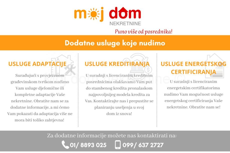 Godina izgradnje: 2020.g.<br /> Vlasništvo uredno <br /><br /> Posrednik: Mislav Plavanjac, Moj dom nekretnine d.o.o.<br /> <br /> *USLUGE ADAPTACIJE*<br /> Surađujući s provjerenom građevinskom tvrtkom nudimo Vam usluge djelomične ili kompletne adaptacije Vaše nekretnine. Obratite nam se za dodatne informacije, a mi ćemo Vam pokazati da adaptacija više ne mora biti toliko zahtjevna! <br /> <br /> *USLUGE KREDITIRANJA*<br />U suradnji s licenciranim kreditnim posrednicima olakšavamo Vam put do stambenog kredita pronalaskom najpovoljnijeg modela kredita za Vas. Kontaktirajte nas i prepustite se planiranju useljenja u svoj dom iz snova! <br /> <br /> *USLUGA ENERGETSKOG CERTIFICIRANJA*<br />U suradnji s licenciranim energetskim certifikatorima nudimo Vam mogućnost usluge energetskog certificiranja Vaše nekretnine. Obratite nam se! <br /> <br /> Za sve dodatne informacije možete nas kontaktirati na broj mob.: 099/637-2727 ili na kontakte navedene u oglasu. Obratite se s povjerenjem! <br /> <br /> Cjelokupna ponuda nekretnina na www.mojdom-nekretnine.hr