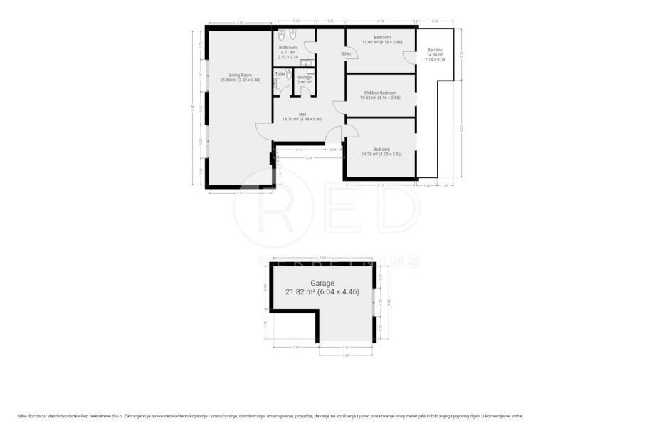 Uz stan dolazi i spremište u suterenu (9,87 m²) te garaža u prizemlju (14,27 m²).