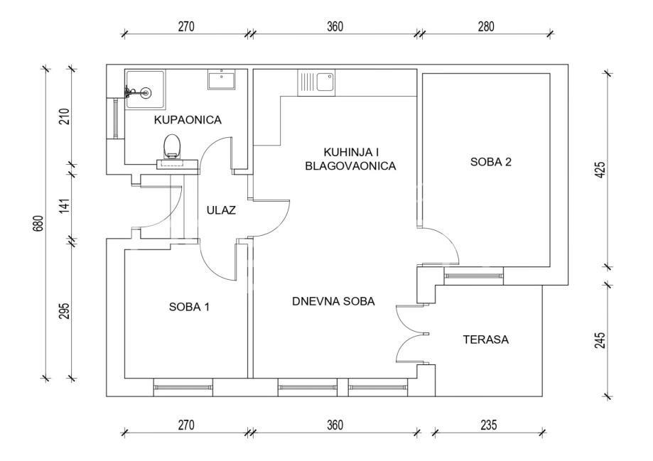 Stan ima vrlo dobar i praktičan raspored koji prostoru daje dojam znatno veće kvadrature. Sastoji se od dnevnog boravka povezanog s kuhinjom i blagovaonicom, dvije spavaće sobe te kupaonice.