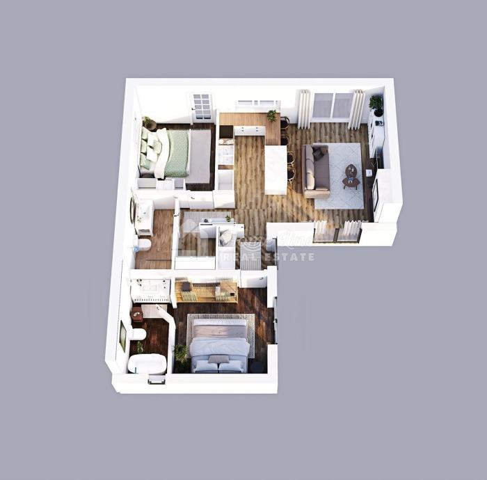 Sastoji se od ulaznog predsoblja, kuhinje i blagovaonice, dnevnog boravka, dvije spavaće sobe, dvije kupaonice i ostave ukupne površine 82 m2.