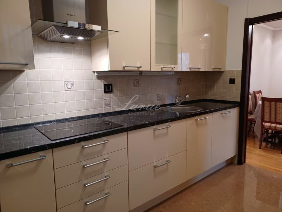 Stan se sastoji od dnevnog boravka s blagovaonicom, kuhinje, velike spavaće sobe, lođe, kupaonice s masažnom tuš kadom i toaletom, zasebnog toaleta, ostave s ugradbenim ormarom, hodnika i spremišta u podrumu. Stan je kompletno renoviran te je potpuno opremljen visoko kvalitetnim namještajem. Klimatiziran, sa svim kućanskim aparatima: perilica suđa, perilica rublja, hladnjak, zamrzivač, pećnica, mikrovalna, napa te ostalim novim kućanskim priborom koji je potreban, stoga su dovoljne osobne stvari za useljenje.