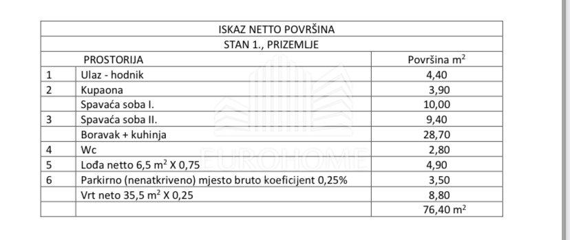 Stan ima ukupnu površinu od 76,40 m². Planirani završetak gradnje je početkom ožujka 2026., nakon čega će se izdati uporabna dozvola i provesti etažiranje.