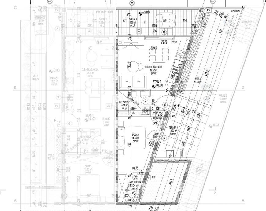Odlično projektirani tlocrt - na ulazu u stan nalazi se otvoreni ulazni hodnik i kupaonica. Prednji dio stana sadrži kuhinju, blagovaonicu i dnevnu sobu, s izlazom na loggiu. Iza se nalazi spavaća soba, simpatičnog nepravilnog oblika.