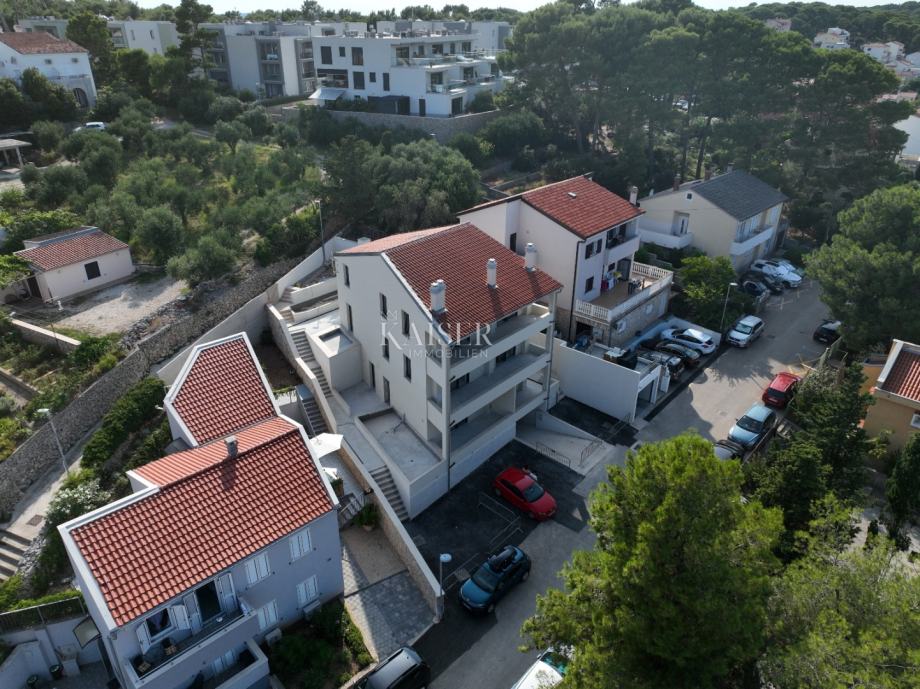Smješten u samom centru te udaljen svega 120 metara od mora, apartman se prostire u stambenoj zgradi od tri etaže s garažom. Apartman na drugom katu je ukupne površine od 105 m2 s okućnicom 25m2.