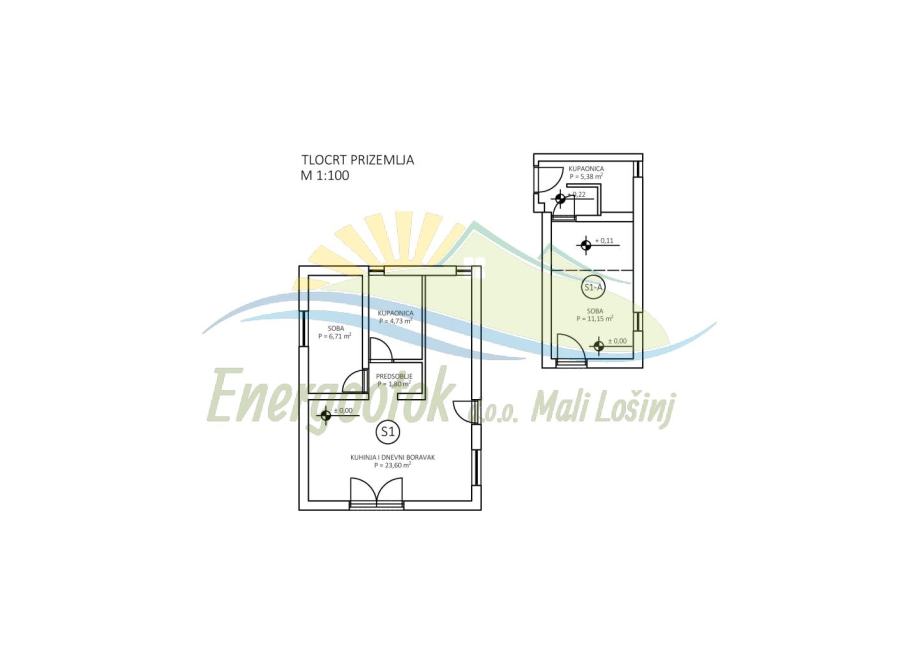 - Dijelovi stana - dnevni boravak, kuhinja, spavaća soba i kupaona - površine 36,84 m²