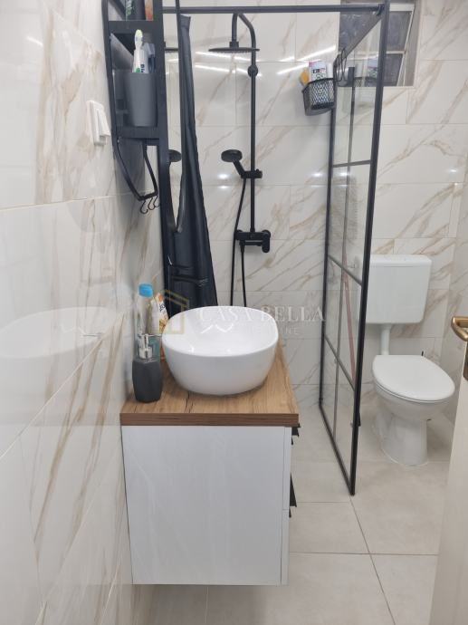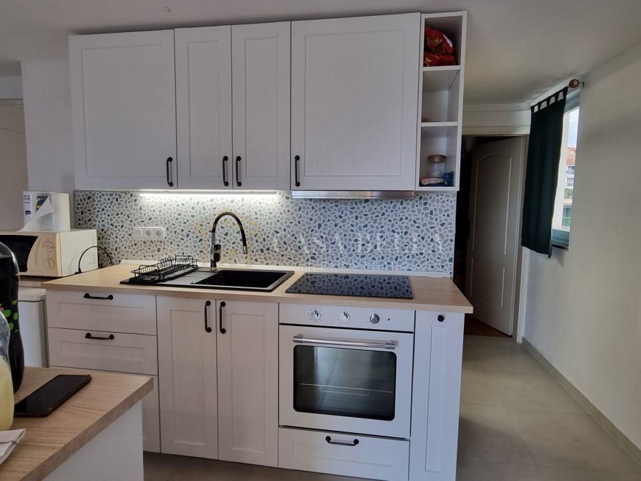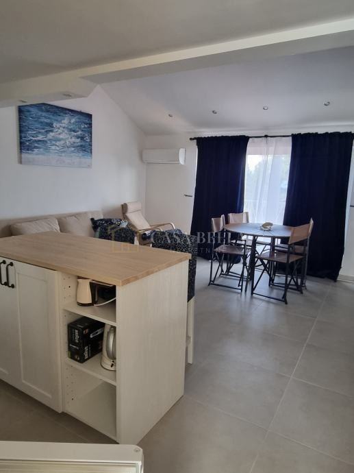 Stan površine 60 m2 sastoji se od dvije spavaće sobe, kupaonice, dnevnog boravka sa kuhinjom i blagavaonicom te francuskim balkonom. Stanu pripada i privatno parkirno mjesto. Nalazi se na 2. katu, samo 50m od mora i u blizini svih potrebnih sadržaja.