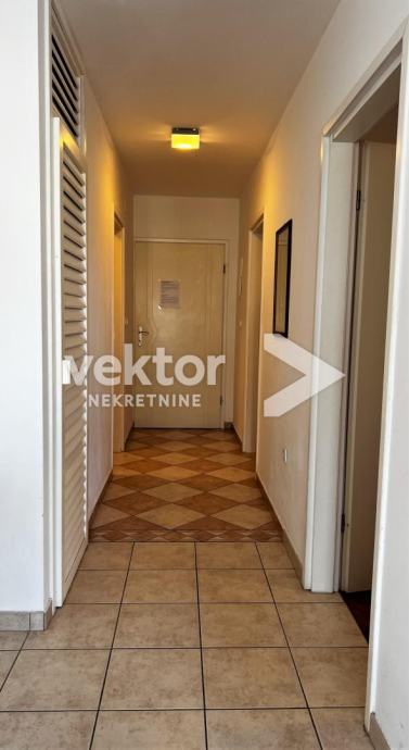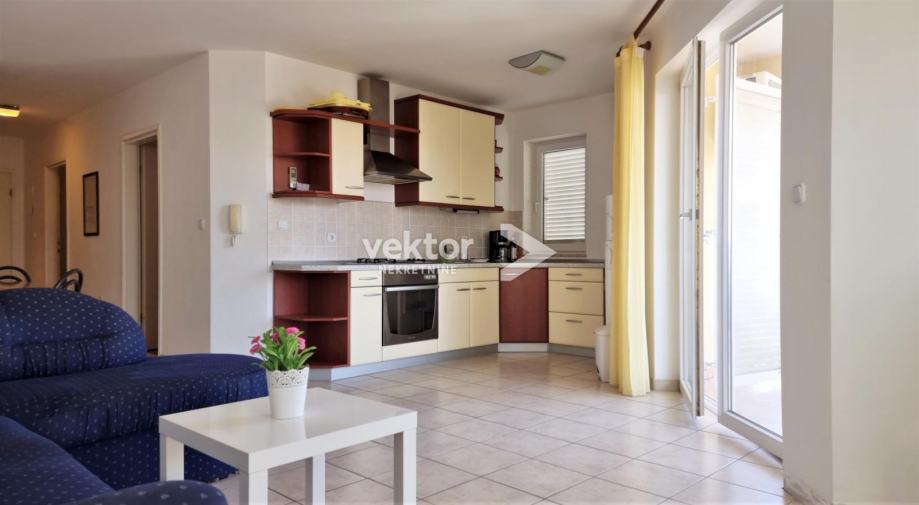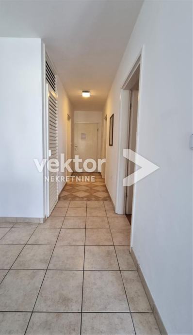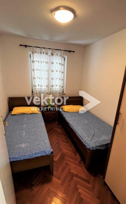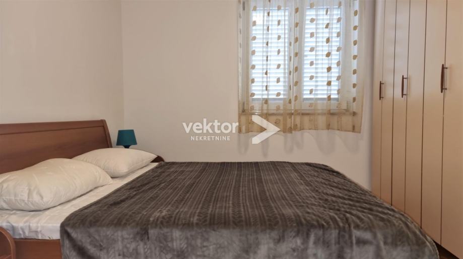 Dnevni boravak sa blagovaonom i kuhinja su južne orijentacije i imaju izlaz na veći, ugodan balkon sa kojeg se vidi more. Dvije spavaće sobe, obje dovoljno velike i kupaonica.