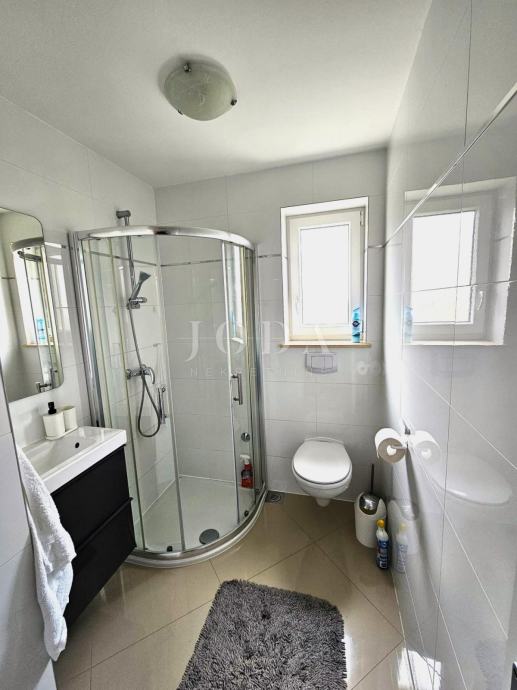 Apartman površine 100 m2 podijeljen je na prvi i drugi kat. Na prvom katu se nalaze prostrani dnevni boravak s izlazom na loggiu s djelomičnim pogledom, kuhinja s blagovaonicom i kupaonica. Na drugom katu se nalazi hodnik, kupaonica i tri spavaće sobe od kojih dvije imaju izlaz na loggiu s koje se pruža otvoren pogled na more. Prizemlje i prvi kat su spojeni unutarnjim stepeništem.