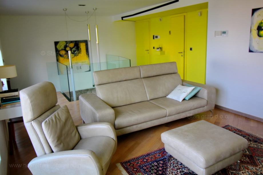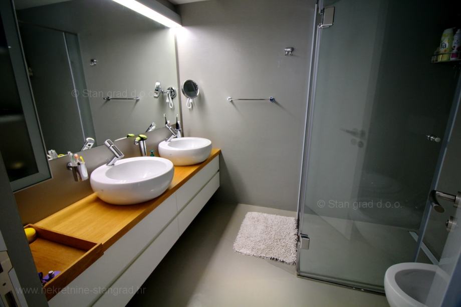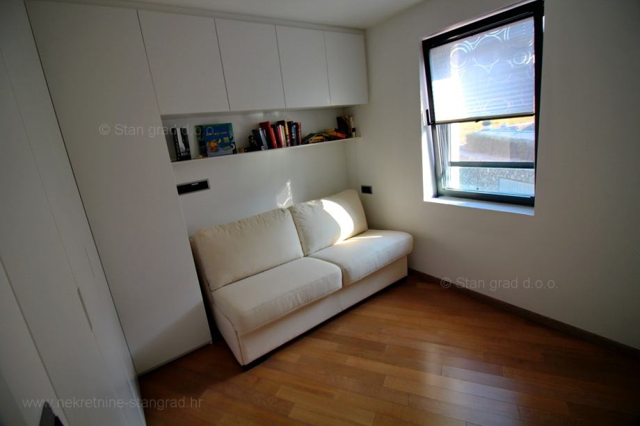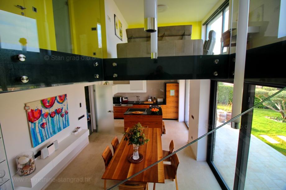Apartman obuhvaća ukupnu površinu od približno 136 m2. U prizemlje se ulazi iz garaže, gdje je dnevni open space prostor sa kuhinjom i blagovaonicom, WC, te se izlazi na prekrasan vrt sa ljetnom kuhinjom i roštiljem. Unutarnje stepenice vode na kat gdje je spavaći prostor sa 3 spavaće sobe sa kupaonicom i dnevni boravak sa pogledom na more. Unutrašnji prostor nekretnine je kompletno opremljen najsuvremenijim dizajnerskim namještajem te uređajima i tehničkom opremom posljednje generacije.