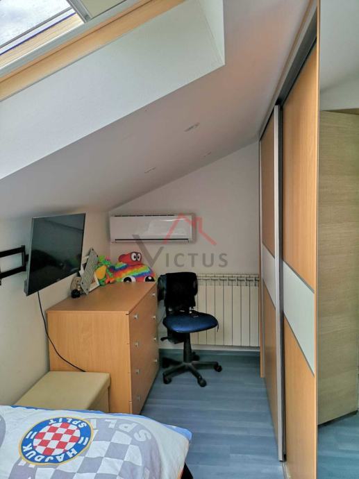 Stan se nalazi na drugom katu i u potkrovlju zgrade. Na prvoj etaži nalaze se dnevni boravak, kuhinja s blagovaonom, spavaća soba, kupaonica i terasa s pogledom na more. Unutarnjim stepenicama se dolazi do potkrovlja u kojemu su smještene još tri spavaće sobe, WC i kotlovnica.