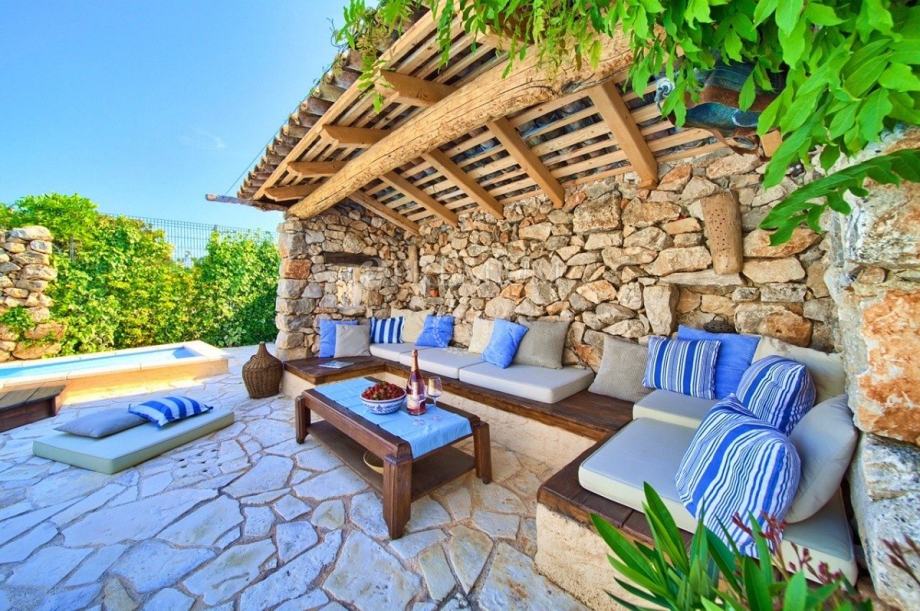 Uz bazen nalazi se sunčalište i prostor za druženje s kamenim stolom za 10 osoba.