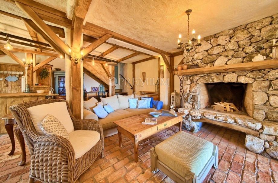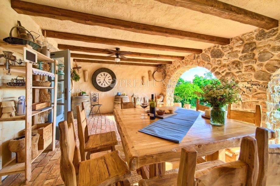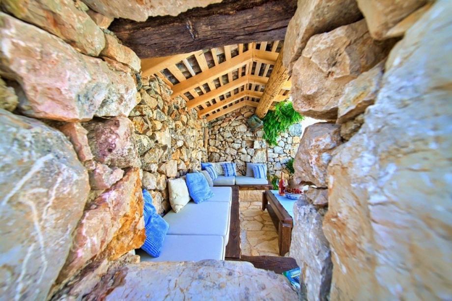 U prizemlju se nalazi ulazni prostor, gostinjski toalet, kuhinja i blagovaona, te prostrani dnevni boravak s kaminom i izlazom na lođu površine 33 m2, koju krase karakteristične kamene volte.