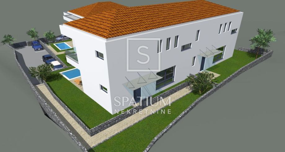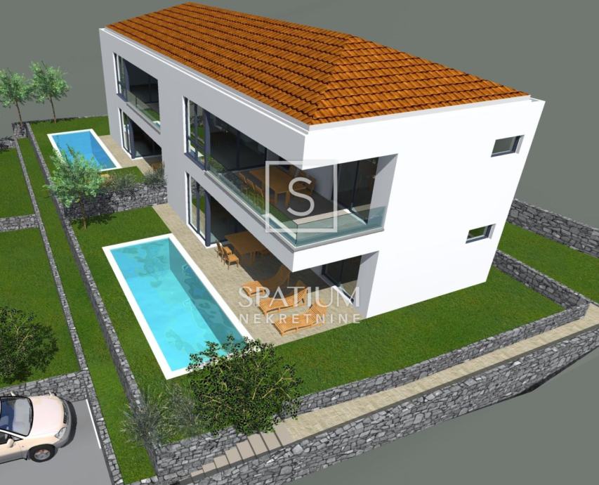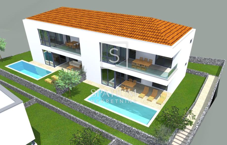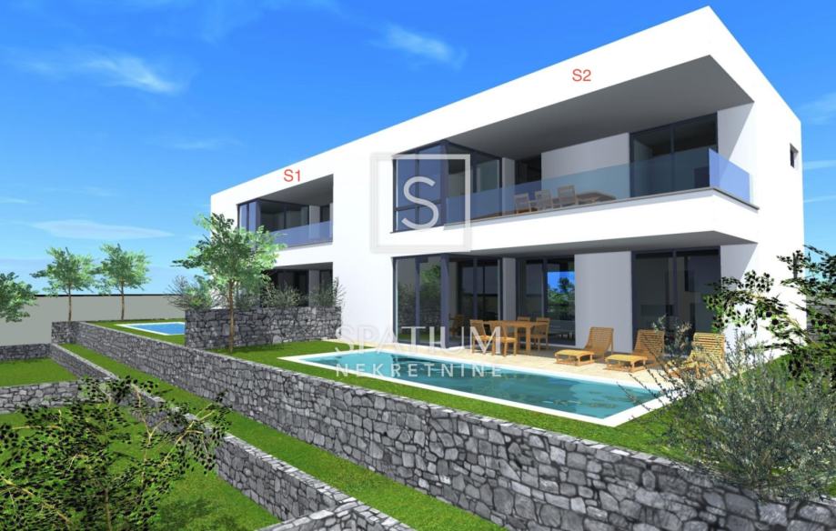 MALINSKA, u ponudu smo dobili dvojnu obiteljsku kuću u izgradnji s dva bazena. Stambena jedinica S2 ima površinu 180m2, a sastoji se od prizemlja i kata.