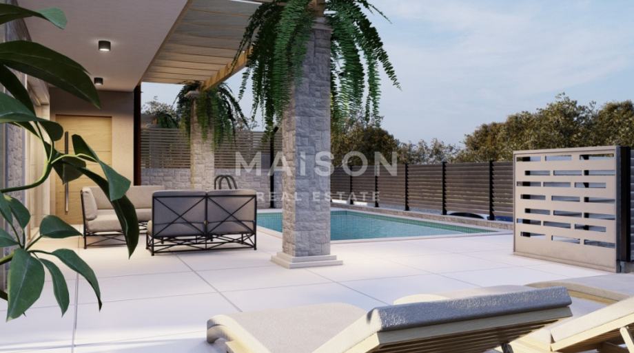 Iz dnevnog prostora izlazimo na terasu i sunčalište na kojem se nalazi bazen i prostor za druženje na otvorenom.