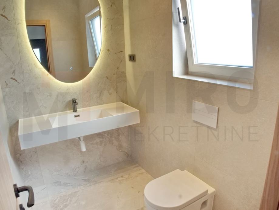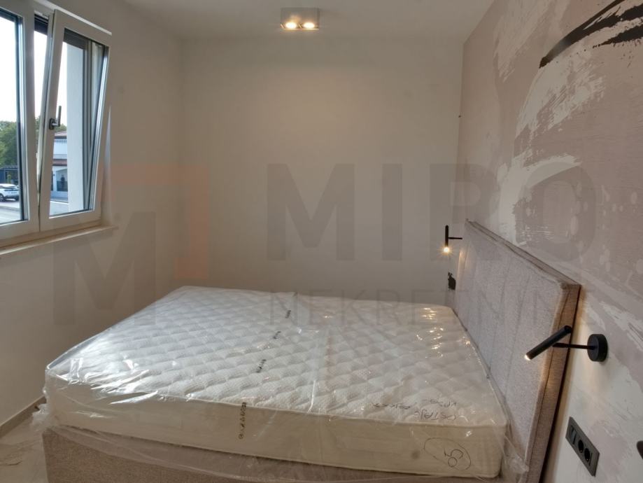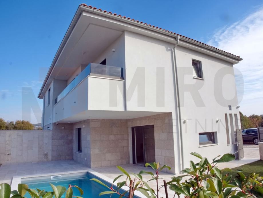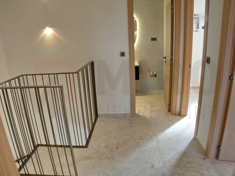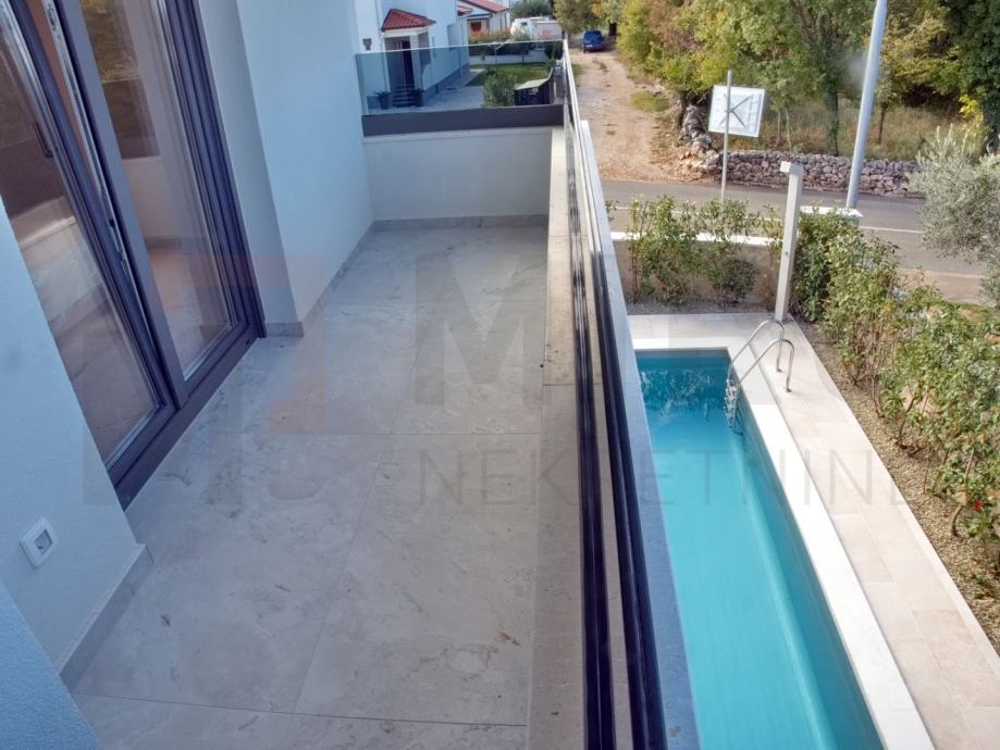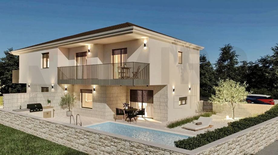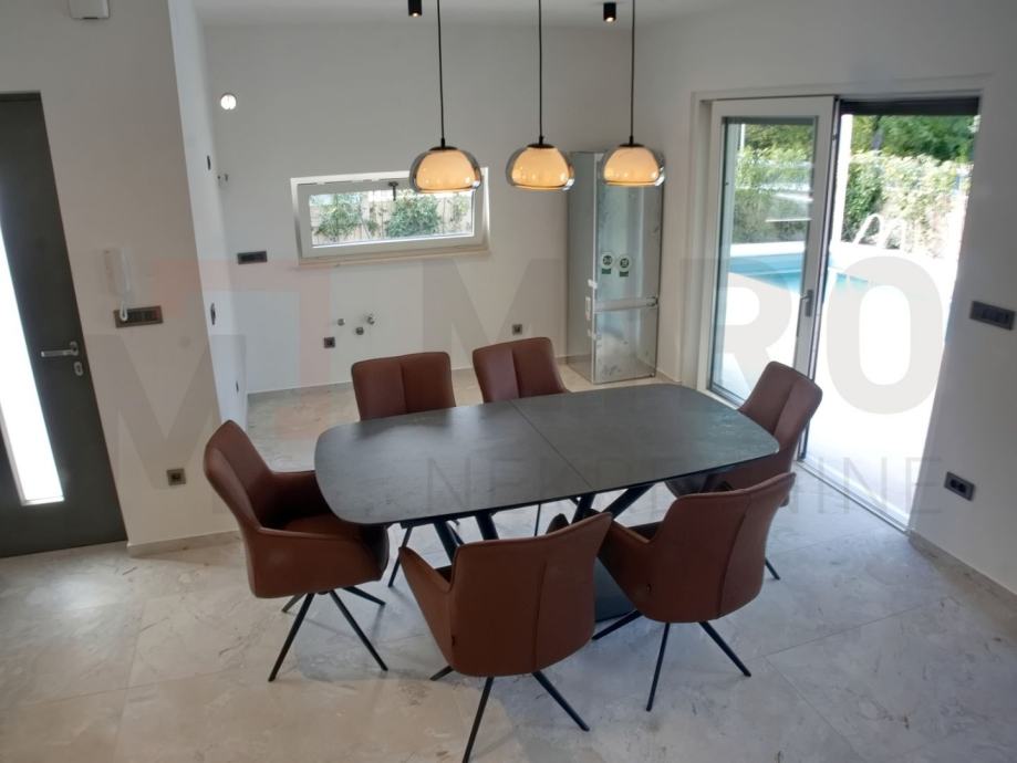 Otok Krk, Malinska, prodaje se moderano namještena dvojna kuća s privatnim bazenom, smještena u mirnom dijelu okolice Malinske, nedaleko od mora. Nova dvojna kuća ukupne stambene površine od 109 m2. Prizemlje se sastoji od natkrivenog ulaza koji vodi u prostrani hodnik, a tu su i gostinjski WC te ostava. Središnji dio prizemlja čini otvoreni prostor u kojem se nalaze kuhinja, blagovaonica i dnevni boravak s izlazom na natkrivenu terasu. S terase se ide prema bazenu i sunčalištu. Unutarnje stepenice vode na prvi kat, gdje su smještene tri spavaće sobe. Master spavaća soba ima vlastitu kupaonicu i izlaz na natkrivenu terasu. Kvalitetna gradnja i oprema: podno grijanje (Vaillant dizalica topline), klima uređaji (Toshiba), električne rolete, grijani bazen s elektrolizom. Dva parkirna mjesta. Završetak gradnje planiran je za kraj 2025. Nekretnina je u sustavu PDV-a i kupac ne plaća porez na promet nekretnina. Prodavatelj jamči čistu vlasničku dokumentaciju zemljišta. Posjetite nas i pronađite kvadrat vašeg doma!