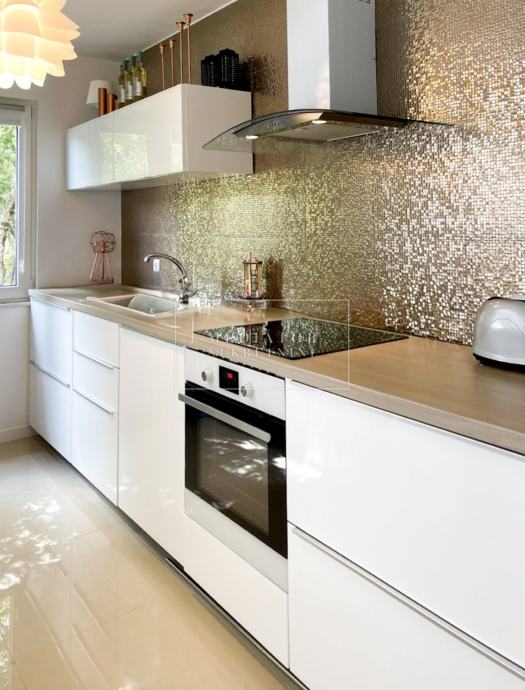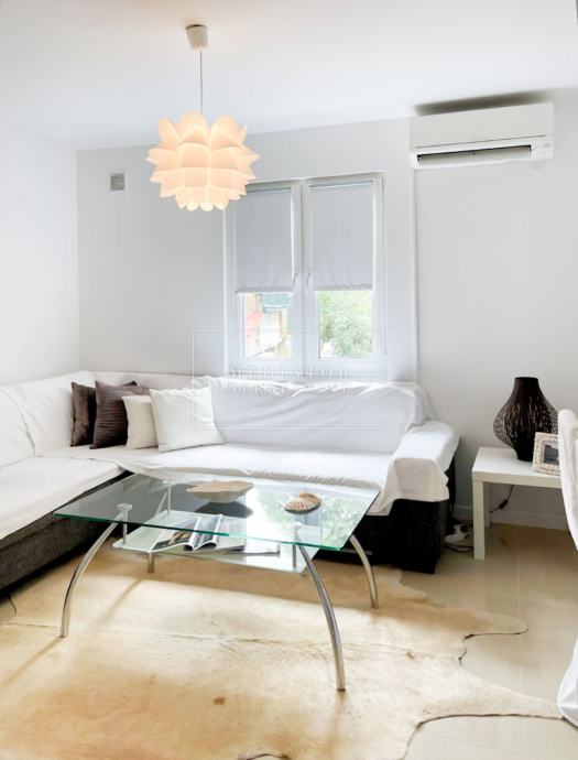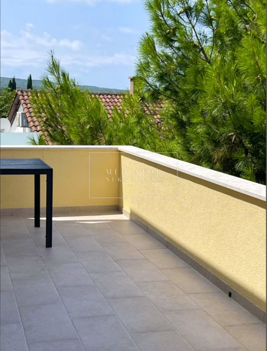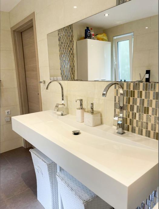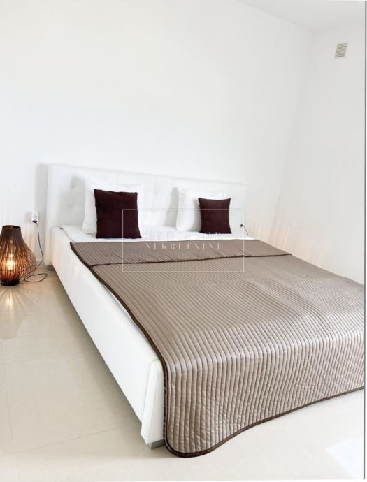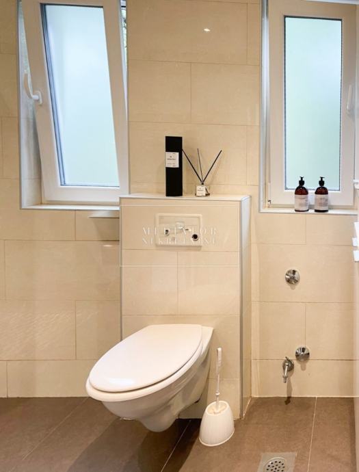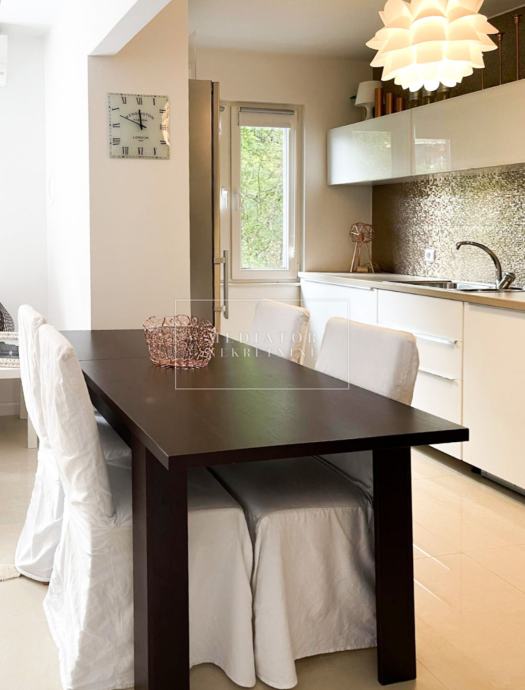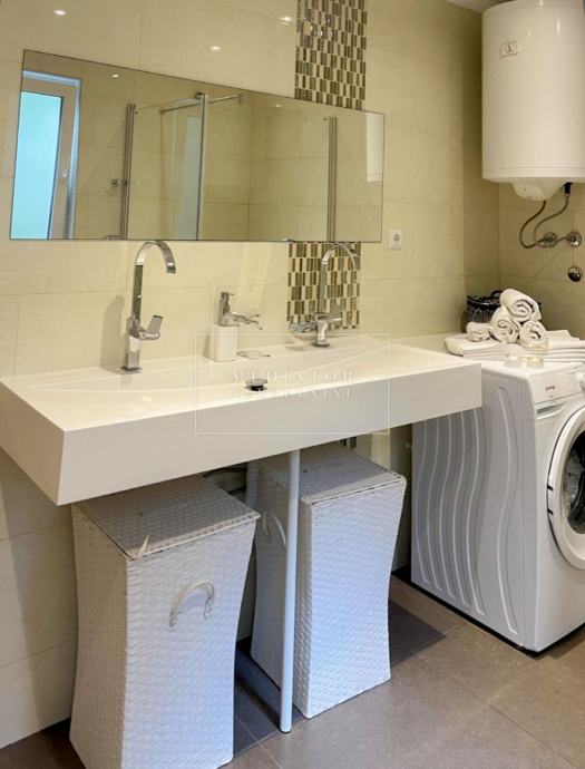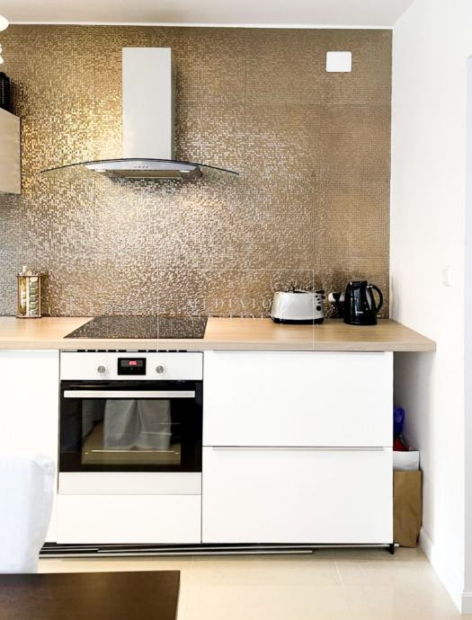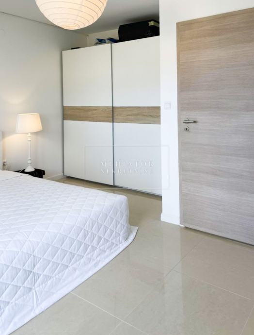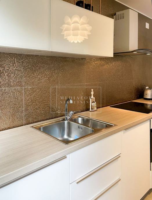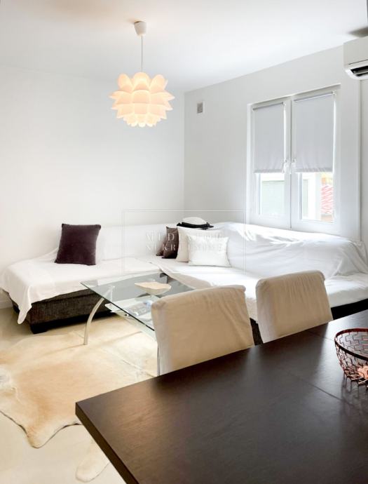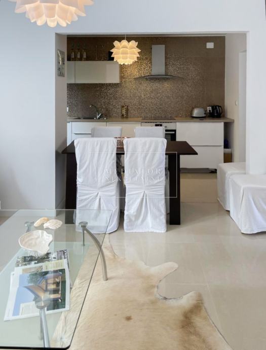 Stan je u cijelosti adaptiran 2021. godine, s naglaskom na modernu estetiku i upotrebu visokokvalitetnih materijala. Dnevni prostor odiše svjetlom i otvorenošću te se nastavlja na veliku natkrivenu terasu s koje se pruža otvoreni pogled na more i zelenilo koje okružuje zgradu. Dvije udobne spavaće sobe imaju izlaz na vlastite balkone, a kuhinja i blagovaonica elegantno su uklopljene u cjelinu dnevnog dijela. Svaki kutak stana osmišljen je promišljeno – od detalja u opremi do rasporeda prostorija koje pružaju maksimalnu funkcionalnost i udobnost.